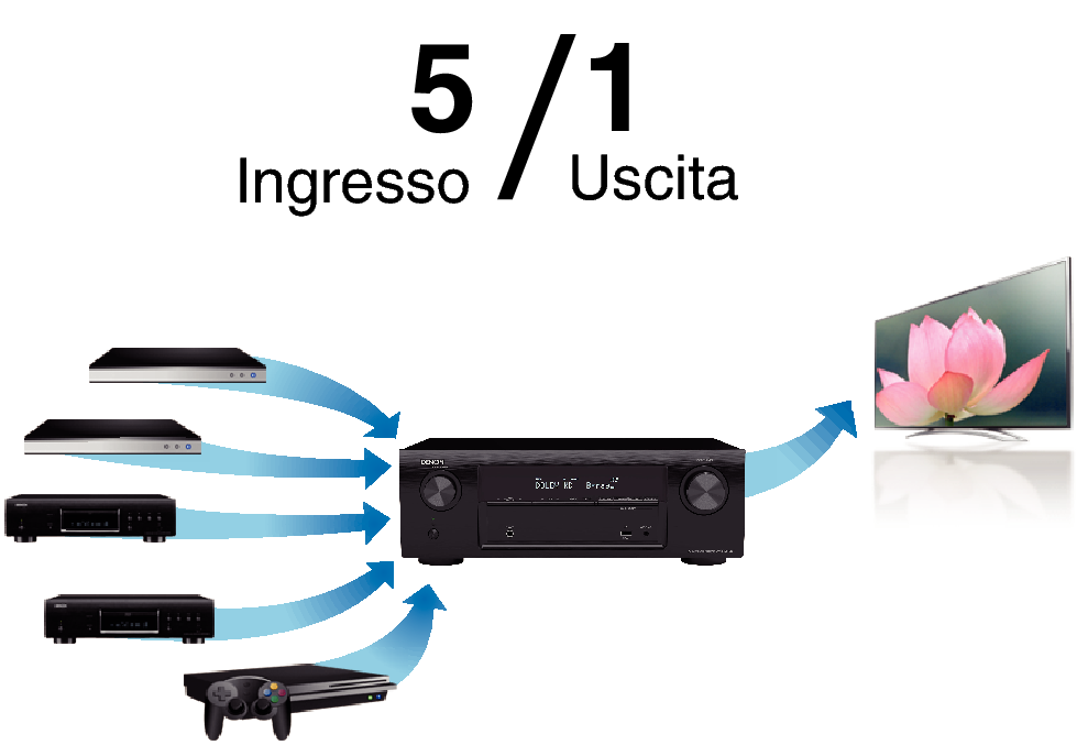 Questa unità è dotata di 5 ingressi HDMI e 1 uscita HDMI che consentono il collegamento a vari dispositivi compatibili con HDMI, quali lettori Blu-ray Disc, console per giochi e videocamere HD.