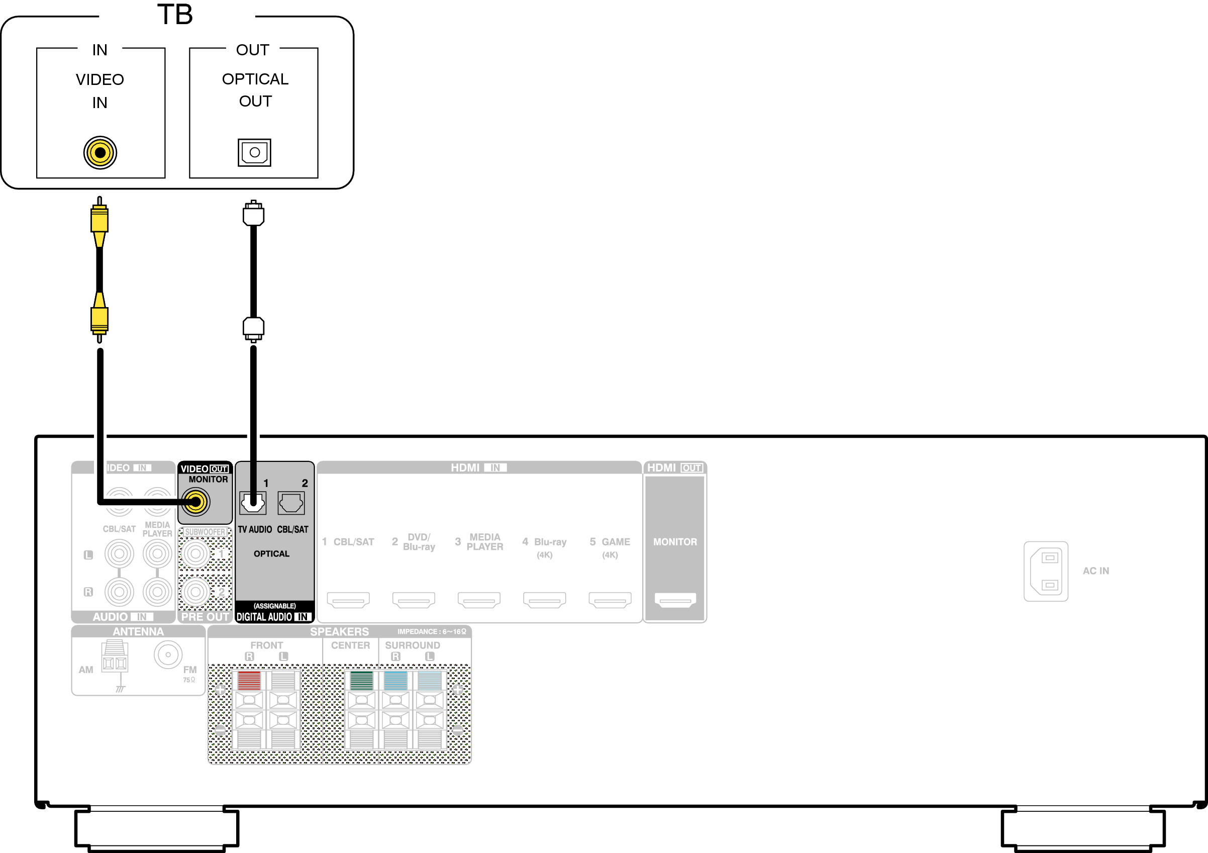Для прослушивания звука с телевизора соедините оба устройства оптическим кабелем.