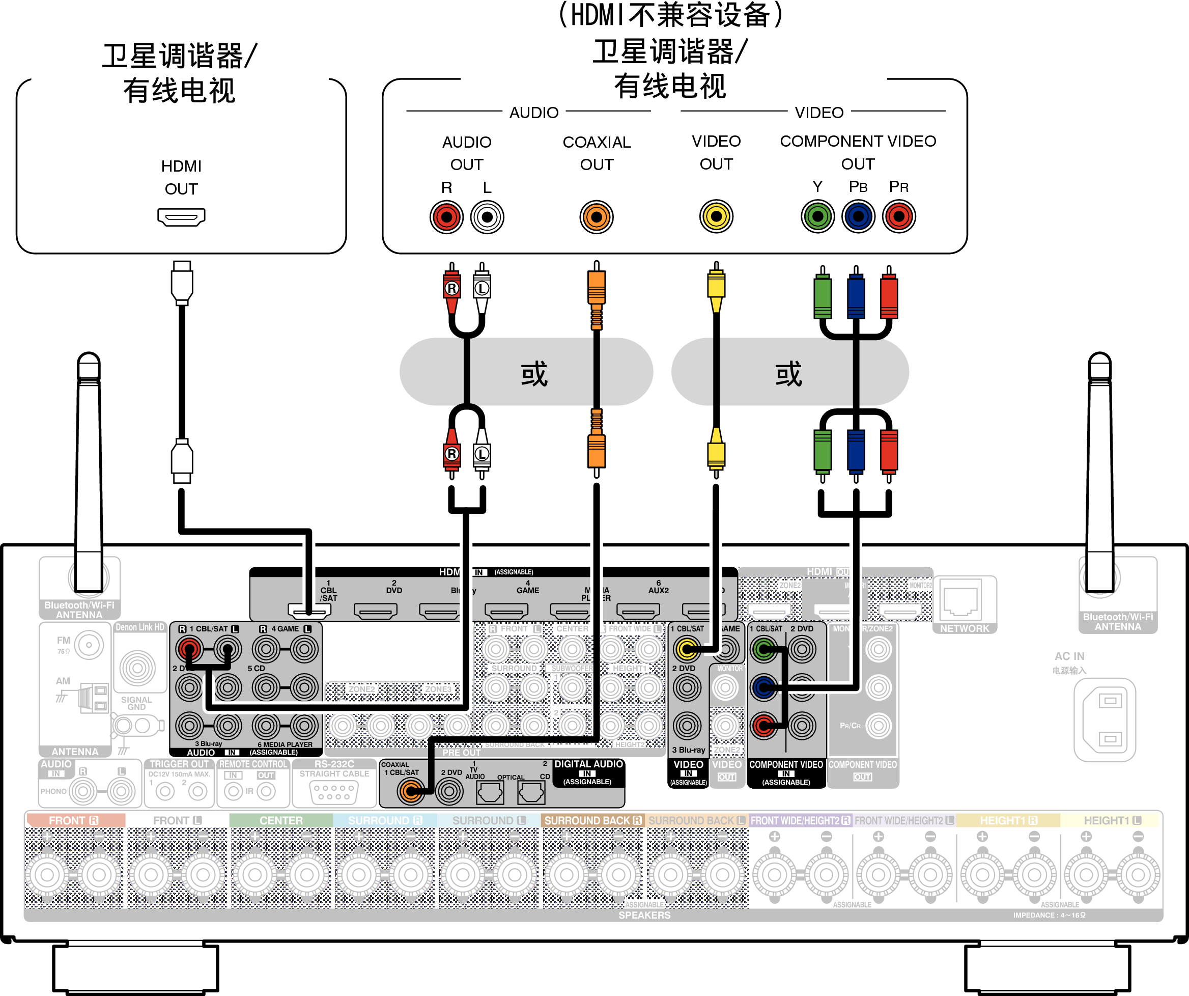 本文以卫星调谐器/有线电视机顶盒的连接为例。