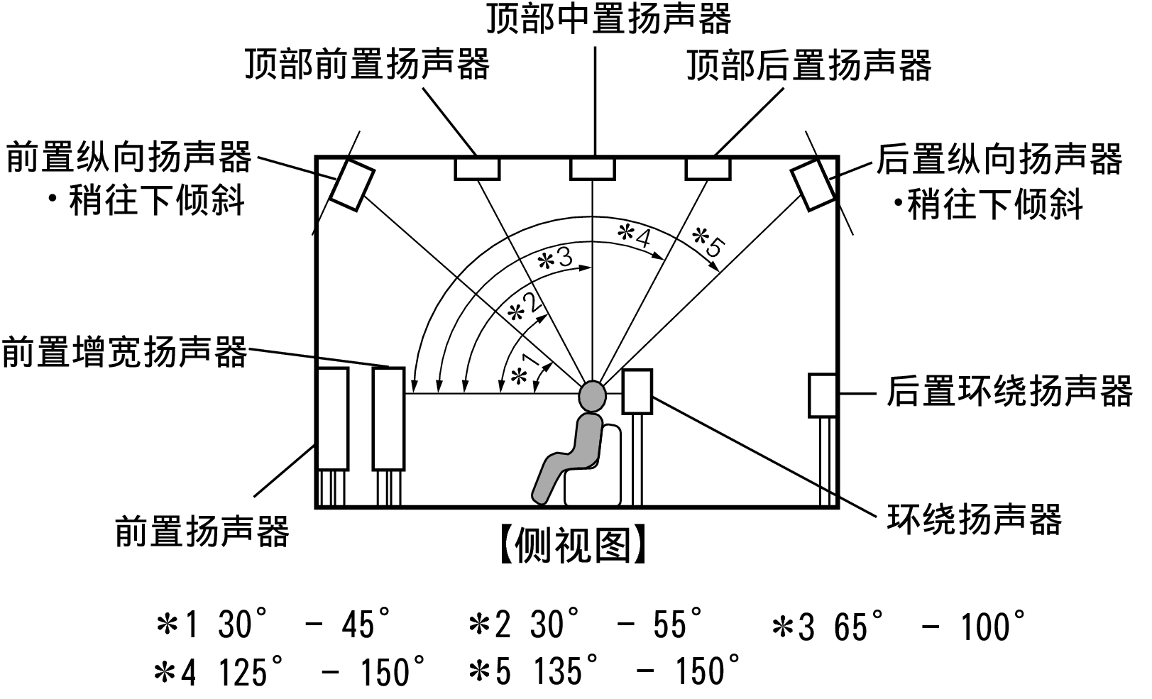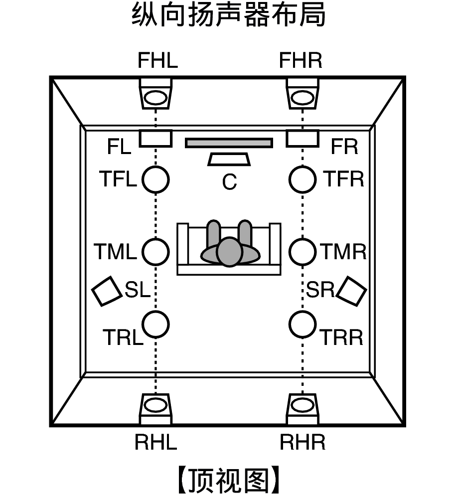 将顶部中置扬声器 (左/右) 安装在主聆听位置的正上方,并与左右前置扬声器对齐。 |