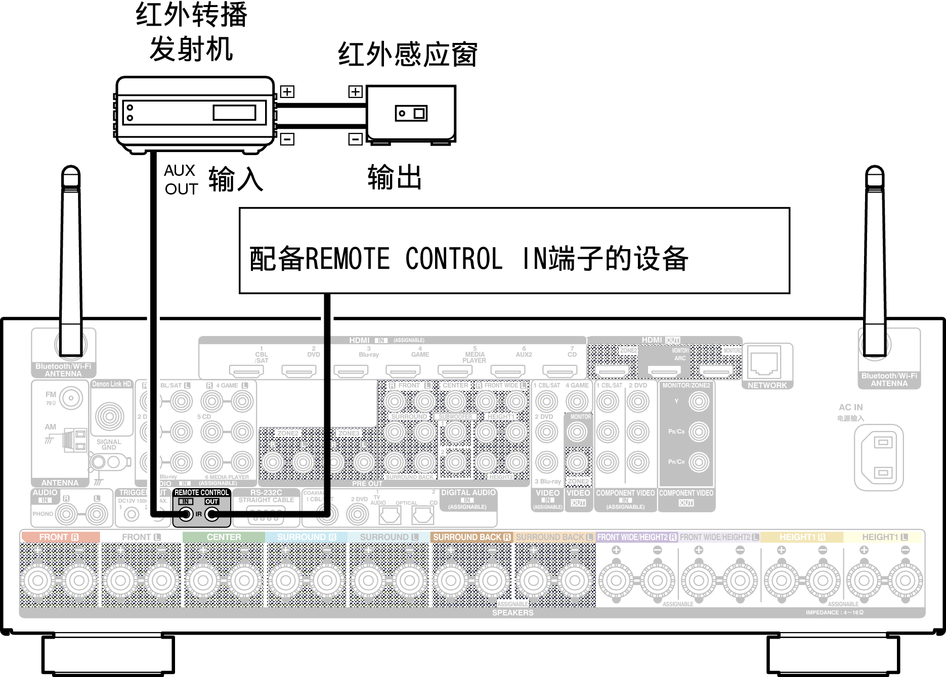 当将本机安装在遥控器信号无法到达的位置(安装在柜内等)时,仍可通过连接遥控接收装置(另售)经由遥控器进行控制。