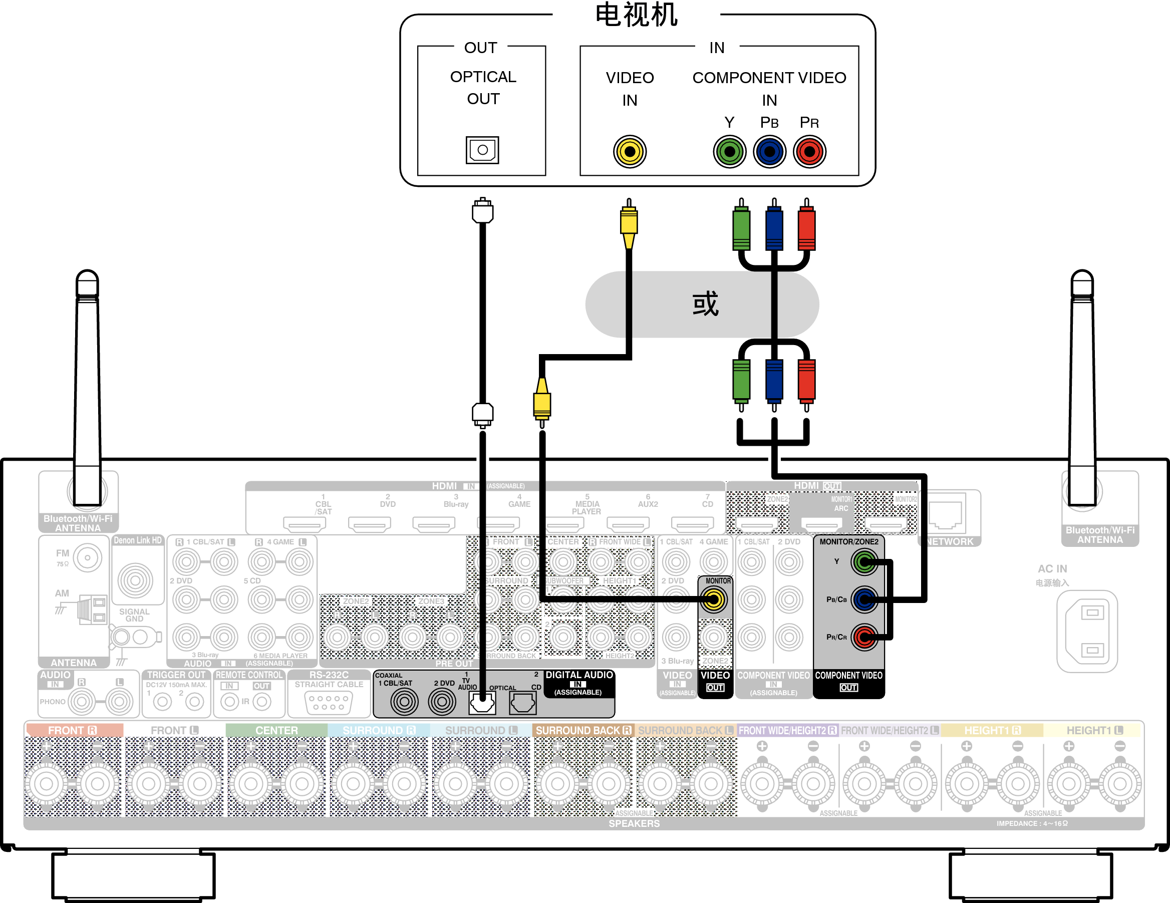 若要在本机上聆听电视机音频,请使用光缆将电视机连接到本机。