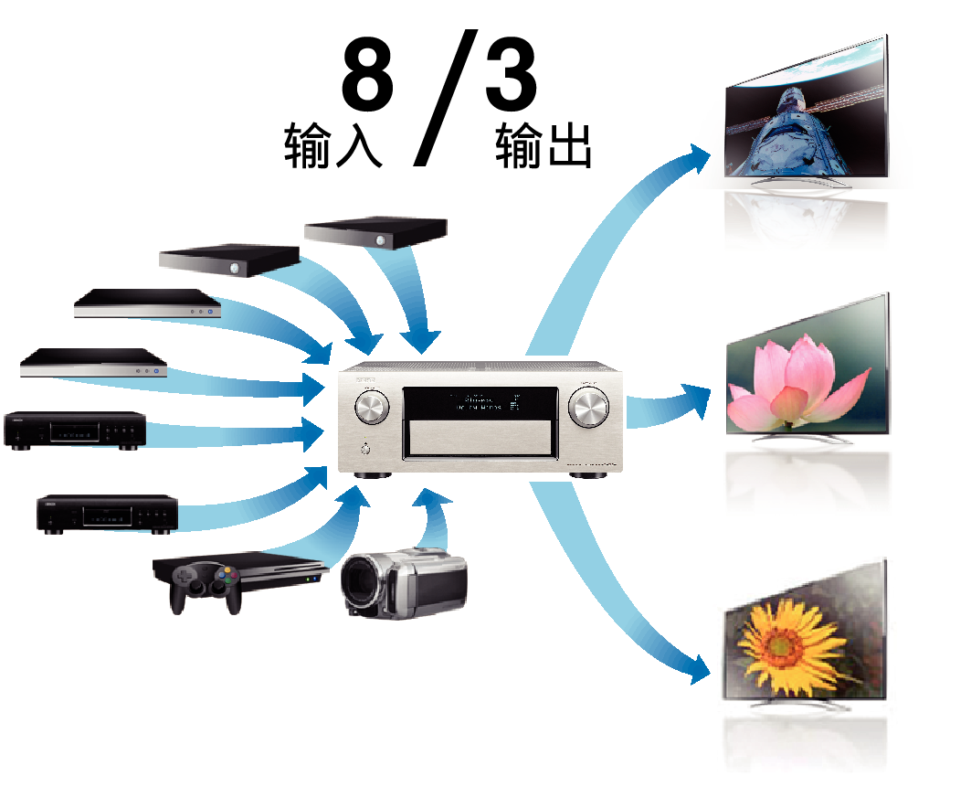 为连接至广泛的数字源,本机配有8个HDMI输入,包括前面板上的1个输入,让您快速、方便地连接摄像机、游戏机或其他HDMI配备的设备。两个HDMI输出用于主房间,第三个HDMI输出用于其他房间。