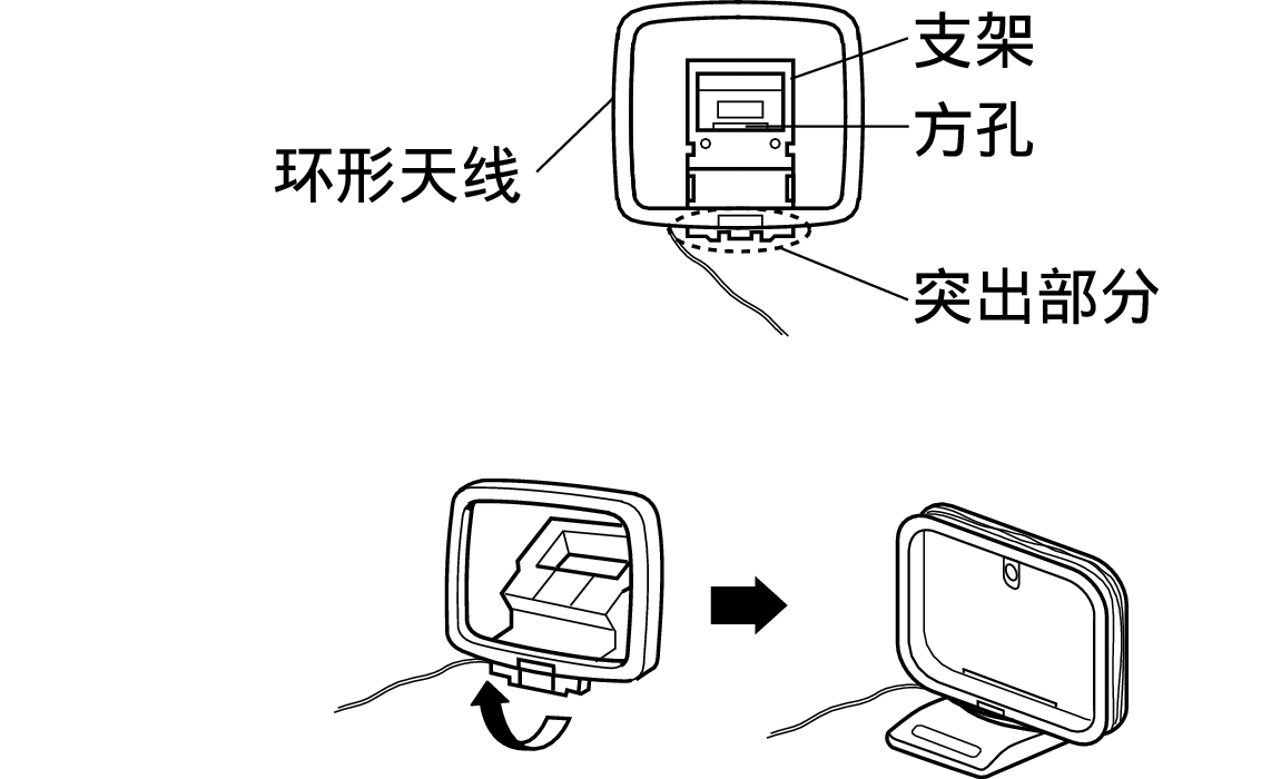 将支架部从背面穿过环形天线底部并使其向前弯曲。