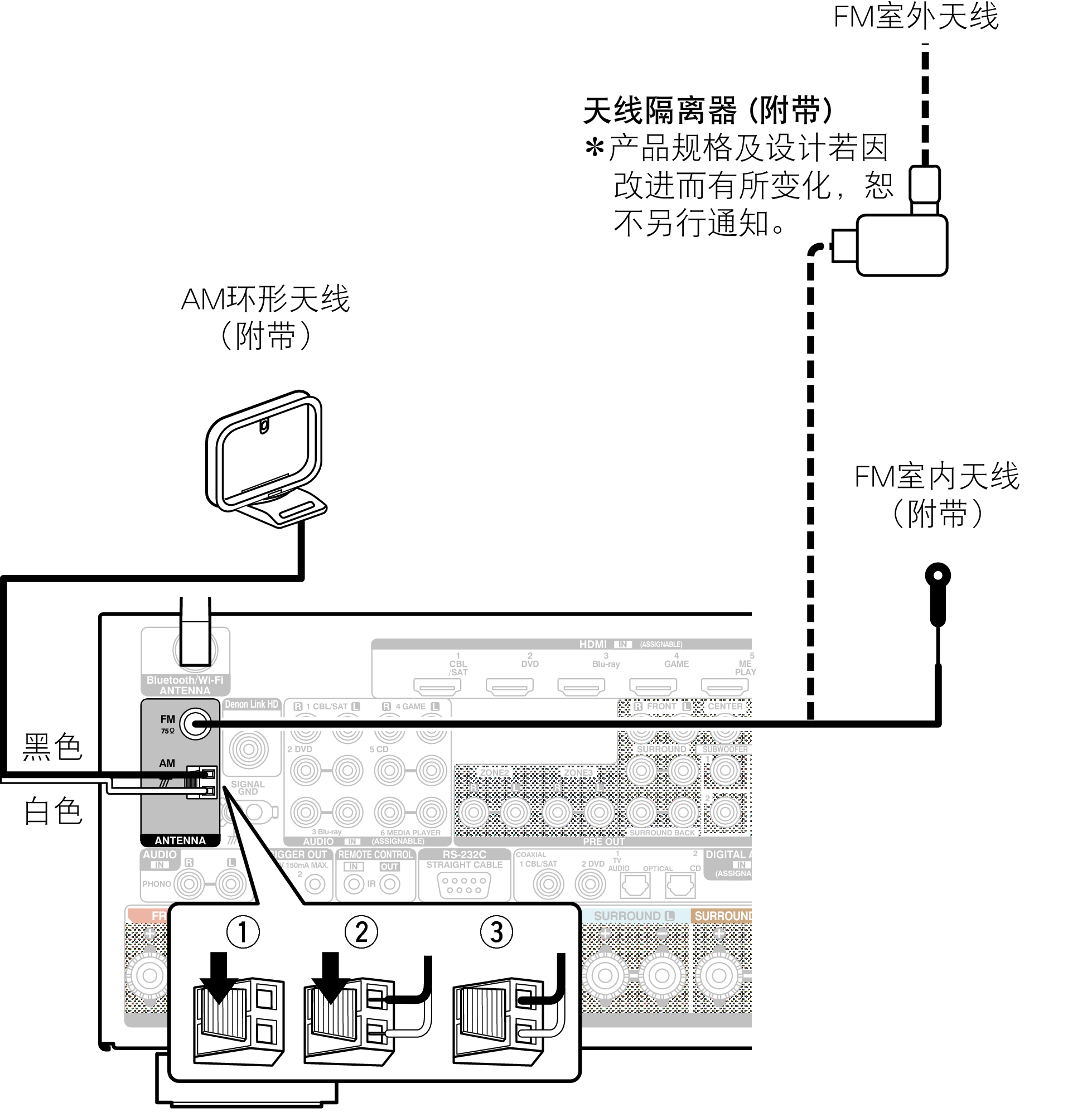使用非附带的FM室内天线时,始终对连接使用天线隔离器。