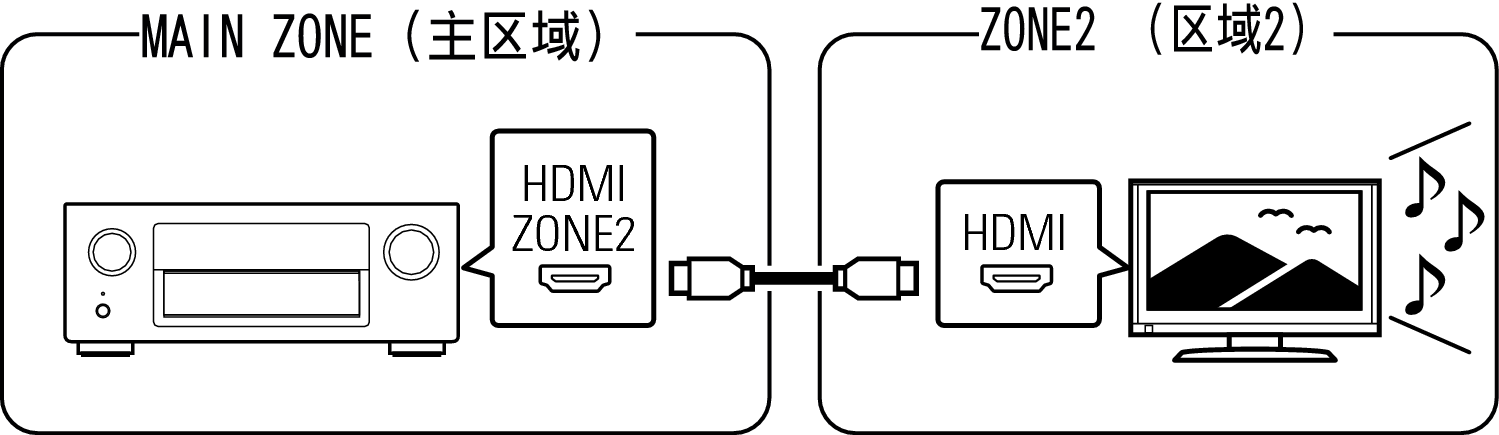 当将电视机连接到HDMI ZONE2 OUT连接器时,您可以在ZONE2(区域2)中从连接到HDMI 1~7 IN连接器的设备播放视频或音频(HDMI ZONE2功能)。