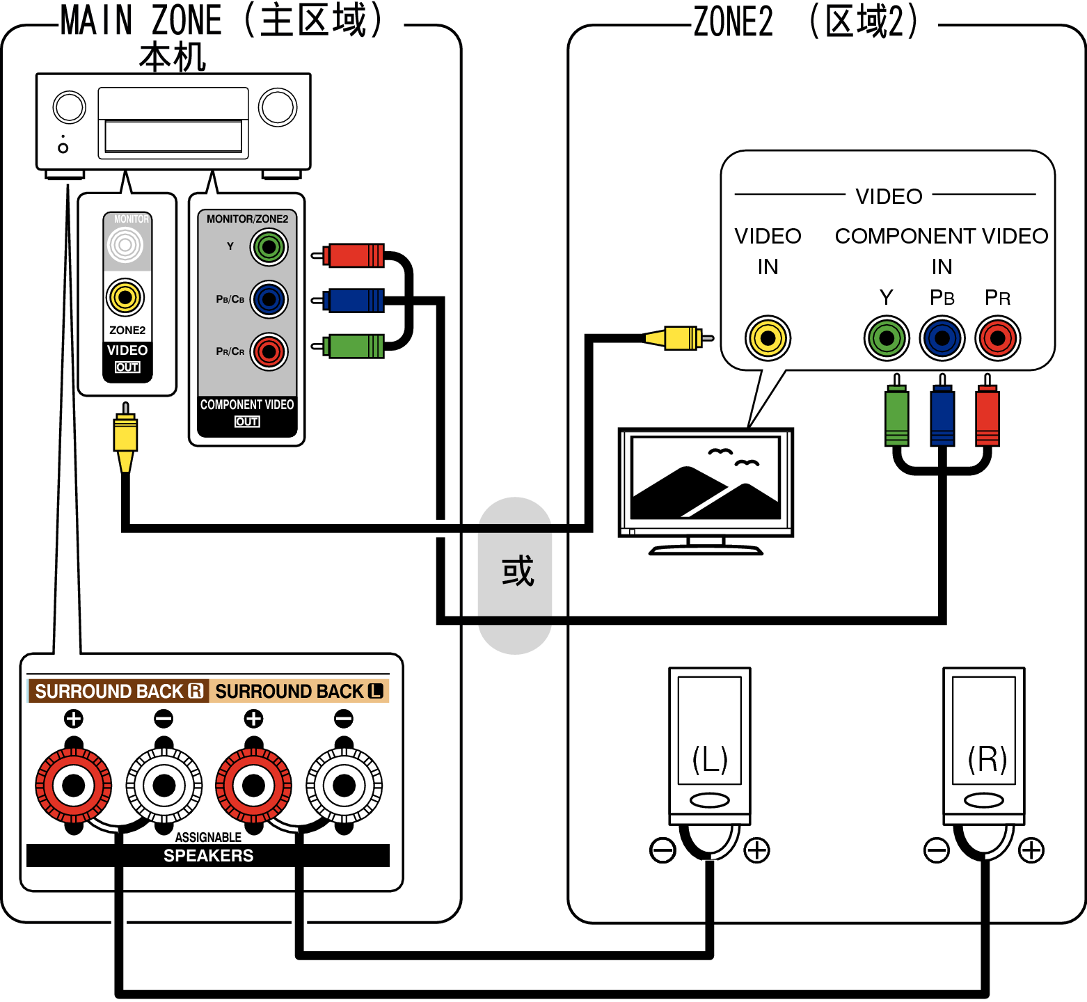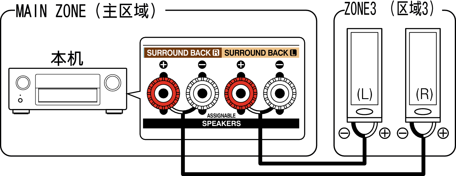 本机的ZONE2 (区域2) 和ZONE3 (区域3) 音频输出端子的音频信号输出到ZONE2 (区域2) 和ZONE3 (区域3) 功率放大器并在这些放大器上播放。