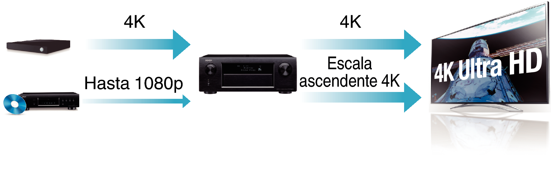 Esta unidad está equipada con una función de escalado de vídeo de 4K que permite la salida de vídeo analógico o SD (definición estándar) a través de HDMI a una resolución de 4K (3840 × 2160 píxeles). Esta función habilita la conexión del dispositivo a una TV utilizando un solo cable HDMI y produce imágenes en alta definición para cualquier fuente de vídeo.