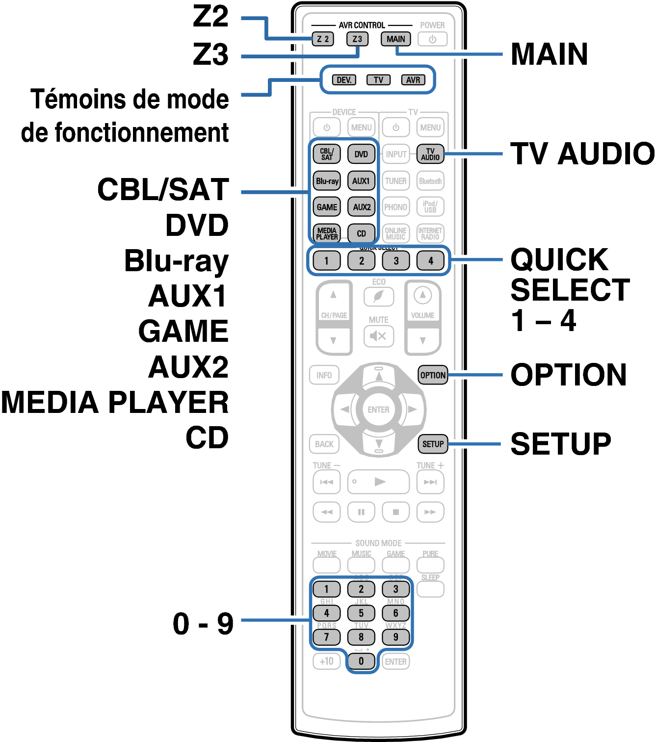 Quand les codes préréglés sont enregistrés sur la télécommande incluse, elle peut alors être utilisée pour le fonctionnement d’appareils différents, comme les lecteurs DVD ou TV d’autres marques.