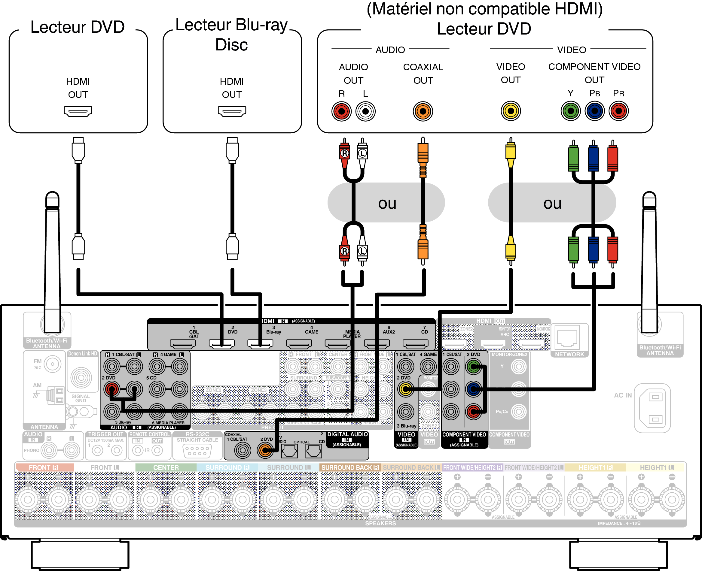 Cette explication utilise la connexion avec un lecteur DVD ou un lecteur Blu-ray Disc comme exemple.