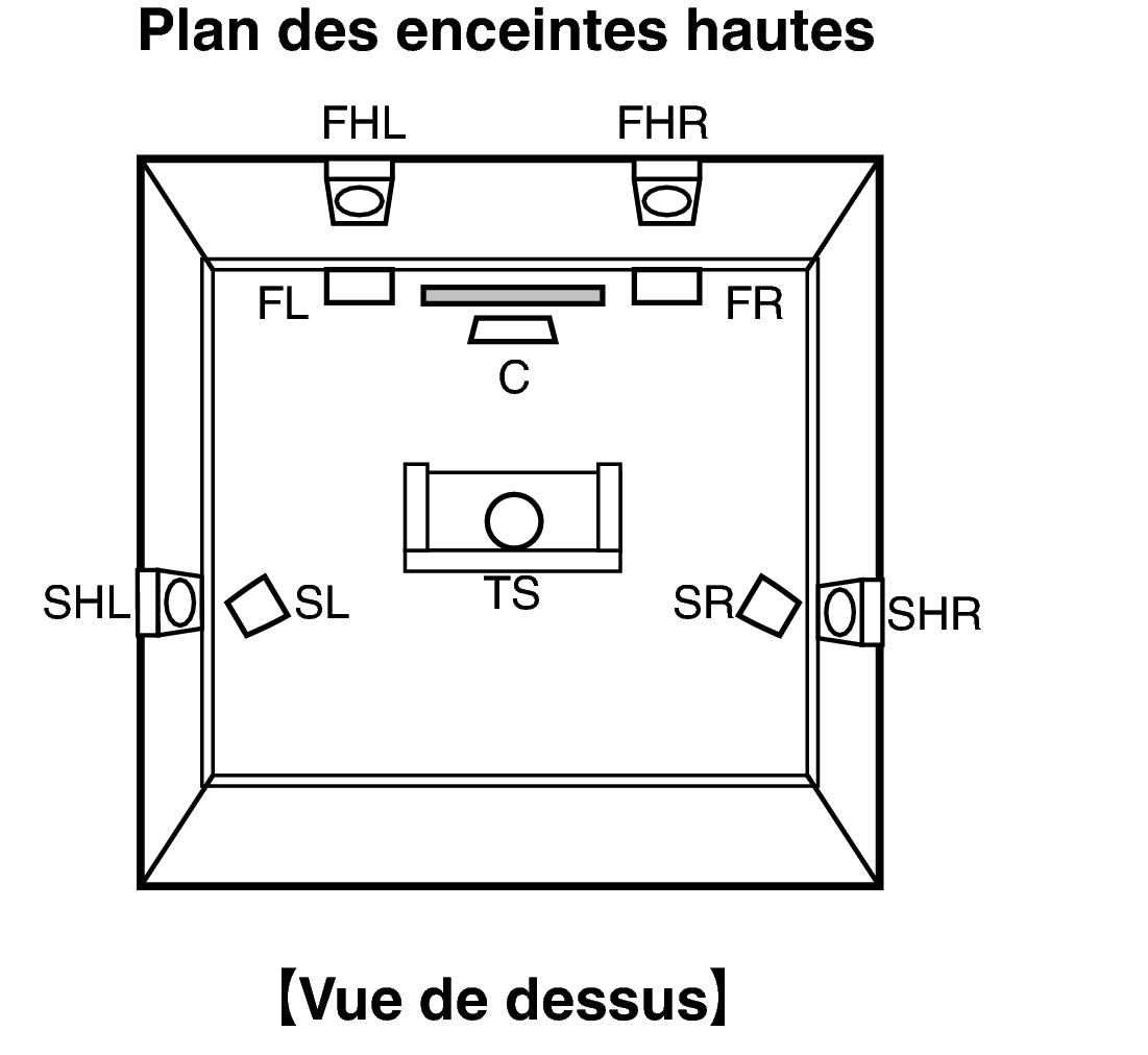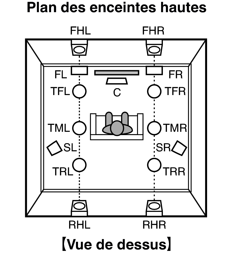 Placez les enceintes hauteur avant gauche et droite directement au-dessus des enceintes avant. Installez-les aussi près que possible du plafond et réglez-les en position d’écoute principale. |