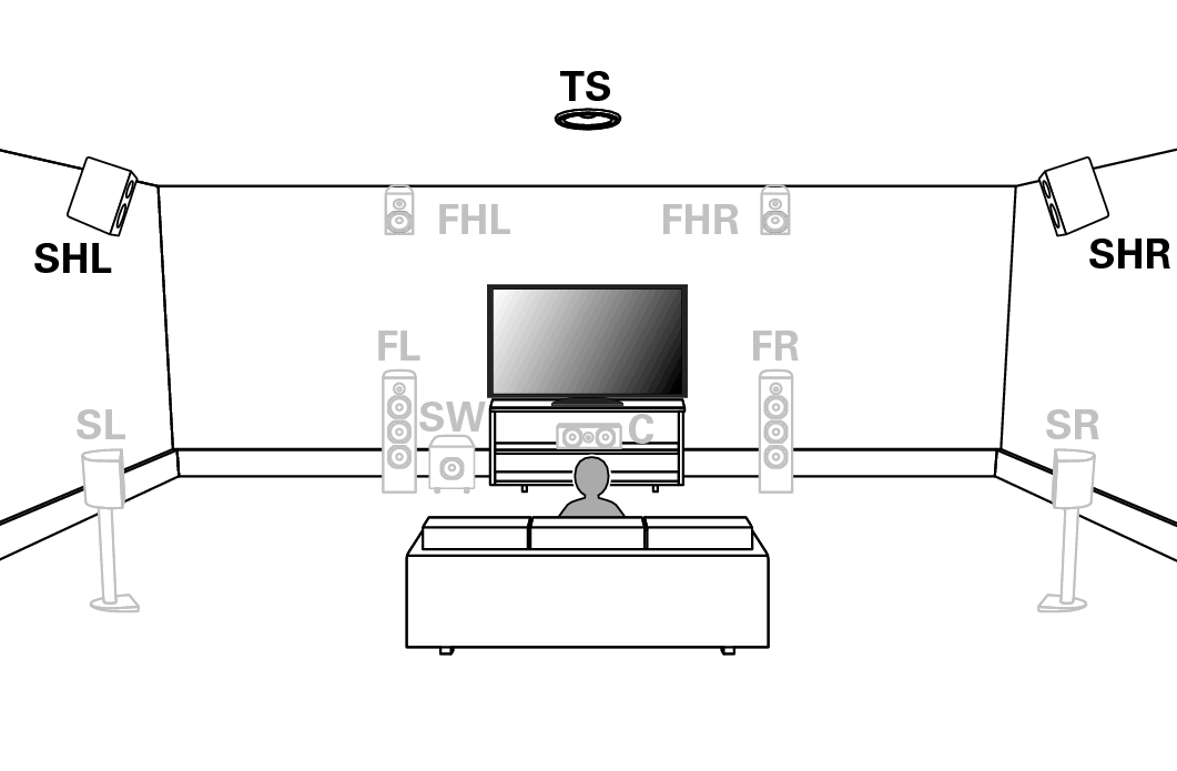 Combinaison d’enceintes 5.1 canaux et Avant haut/Hauteur surround/Surround plafond.