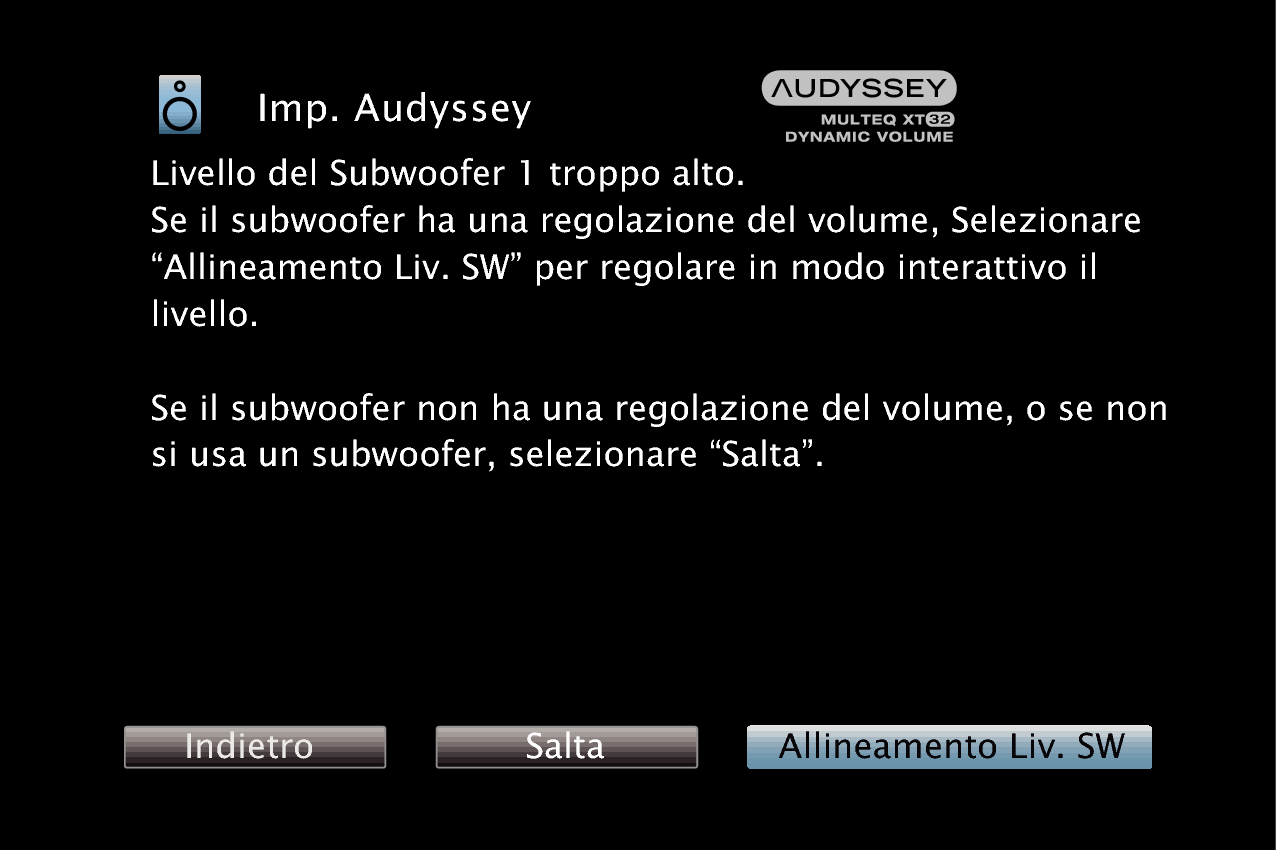 Il livello ottimale di ciascun canale dei subwoofer per la misurazione Imp. Audyssey® è di 75 dB.