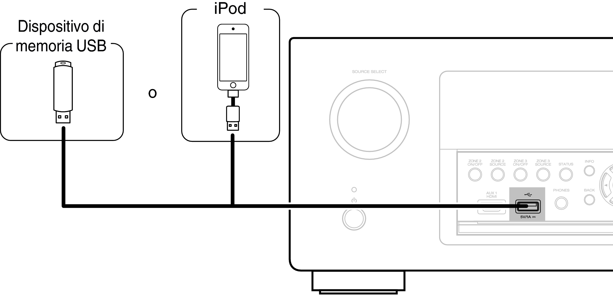 Per le istruzioni sul funzionamento vedere “Playing an iPod” link o “Playing a USB memory device” link.