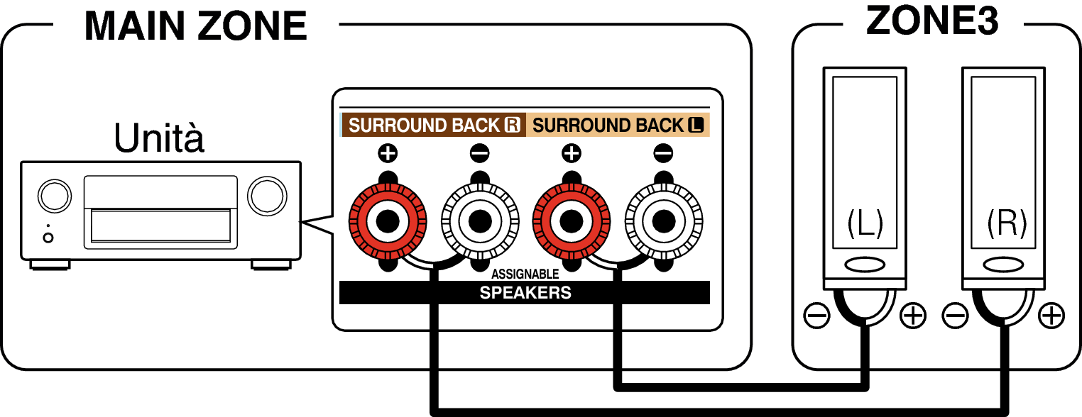 I segnali audio dei connettori di uscita audio della ZONE2 e ZONE3 dell’unità sono trasmessi agli amplificatori della ZONE2 e ZONE3 e riprodotti su questi amplificatori.