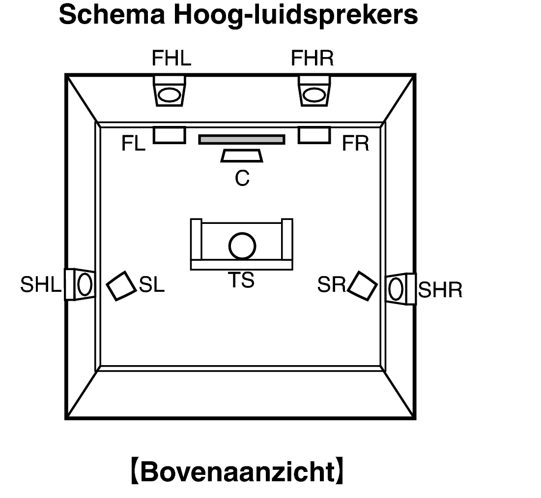 Plaats de linker- en rechterluidsprekers FRONT HEIGHT direct boven de voorluidsprekers. Monteer ze zo dicht mogelijk bij het plafond en richt ze naar de hoofdluisterpositie.