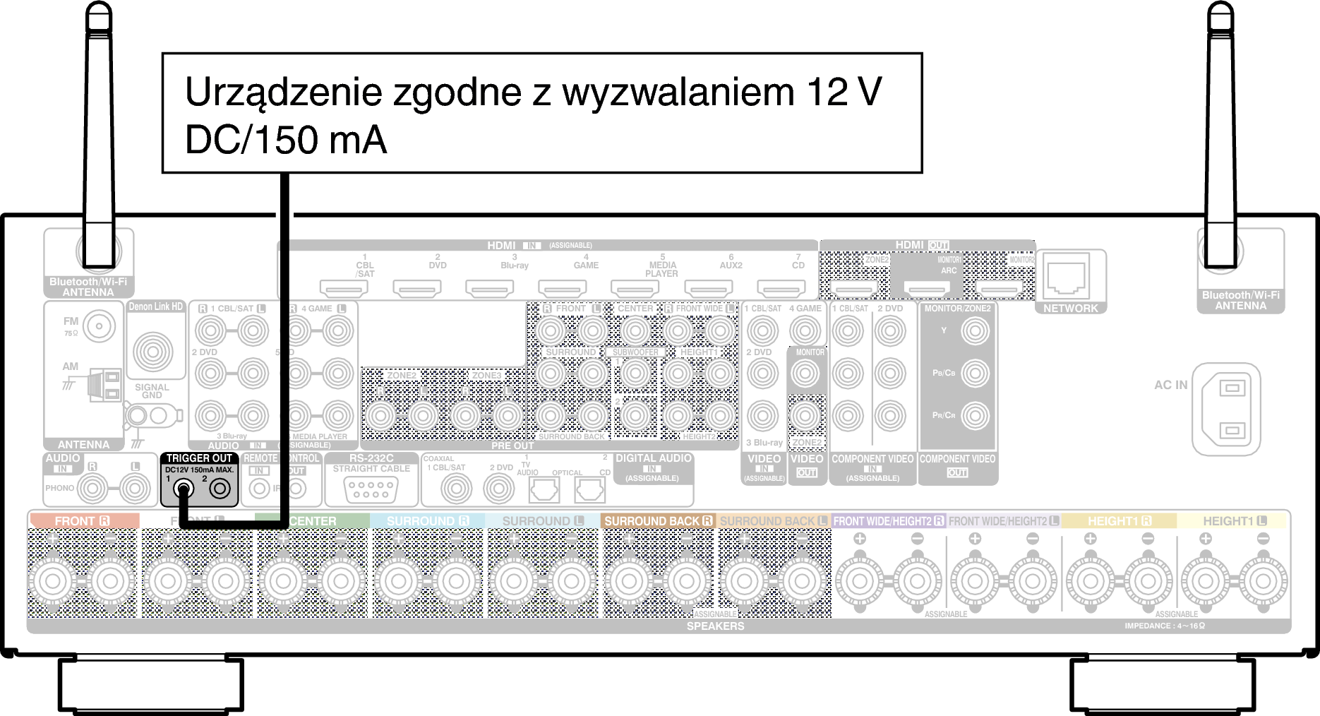 Jeżeli dopuszczalny poziom wejściowy dla podłączonego urządzenia przekracza 12 V DC/150 mA lub też złącze wejściowe urządzenia jest zwierane, gniazdo TRIGGER OUT nie może być użyte. W tym przypadku, wyłącz zasilanie urządzenia i odłącz go.