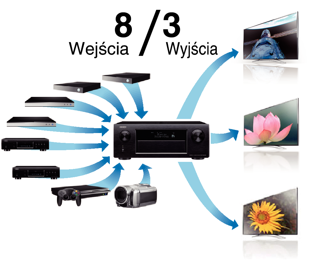 W celu podłączenia do szerokiego zakresu źródeł sygnału cyfrowego, to urządzenie posiada 8 wejść HDMI, w tym 1 na panelu przednim, które pozwala szybko i wygodnie podłączyć kamerę, konsolę do gier lub inne urządzenia wyposażone w HDMI. Są podwójne wyjścia HDMI dla pomieszczenia głównego oraz trzecie wyjście HDMI dla innego pomieszczenia.