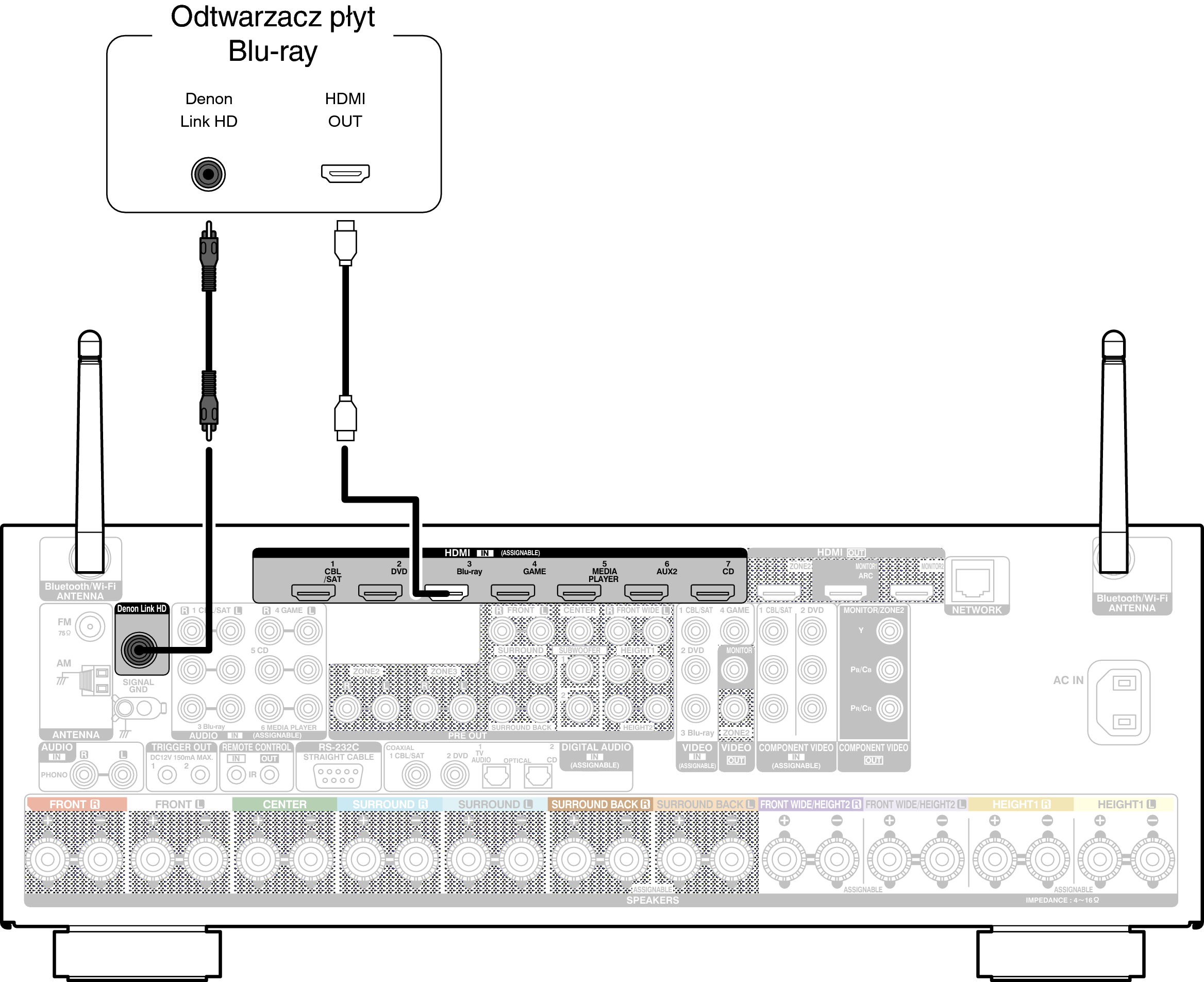Ta metoda podłączenia wymaga zarówno połączeń HDMI oraz Denon Link HD.