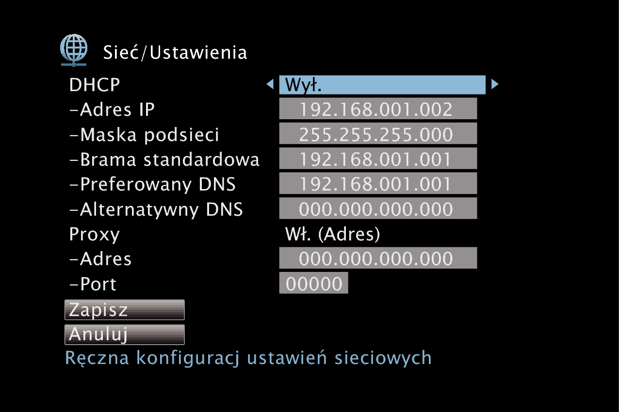 Skonfiguruj ustawienia sieciowe ręcznie. |
