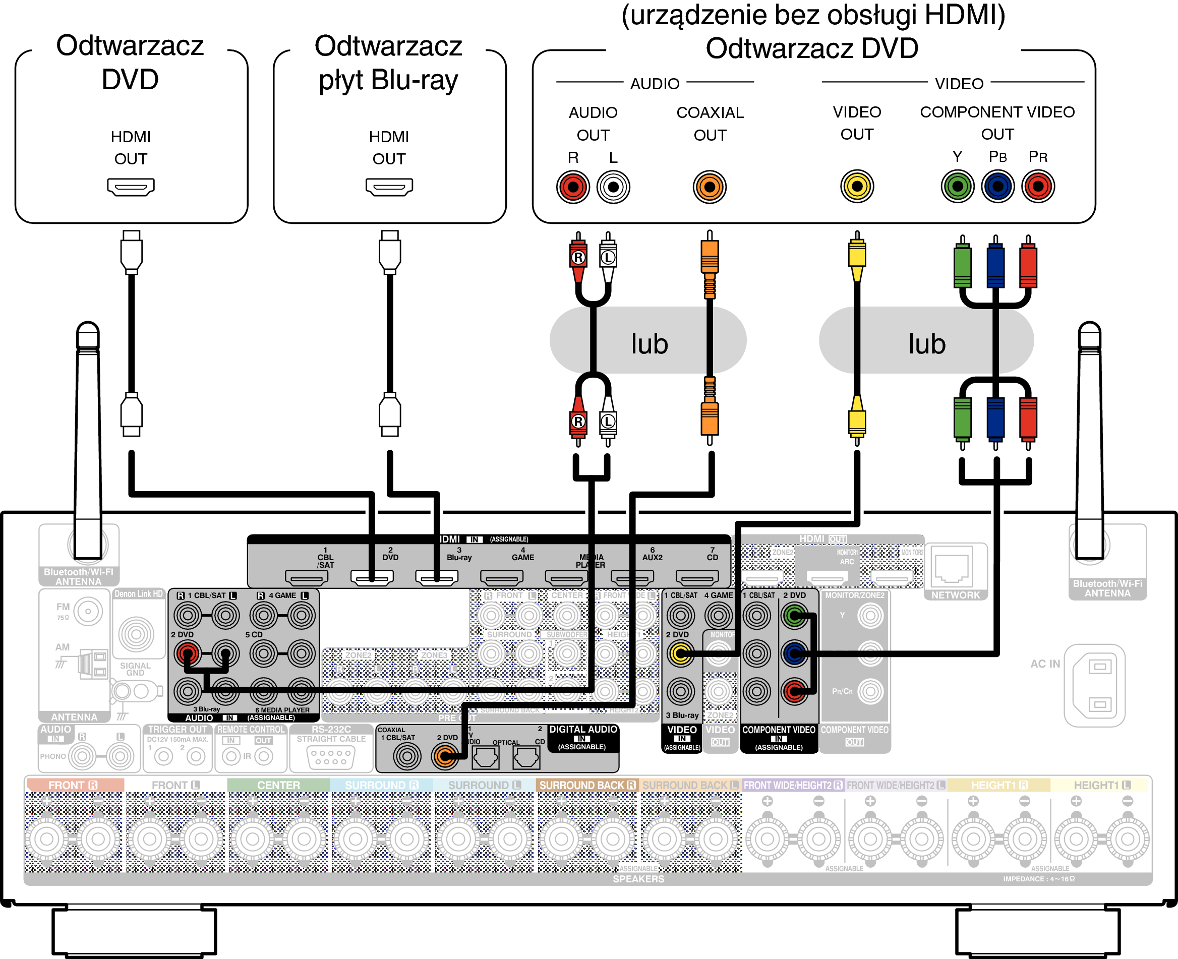 W przypadku podłączania Odtwarzacza Płyt Blu-ray, który jest kompatybilny z Denon Link HD, patrz “Podłączanie odtwarzacza płyt Blu-ray kompatybilnego z funkcją Denon Link HD”link.