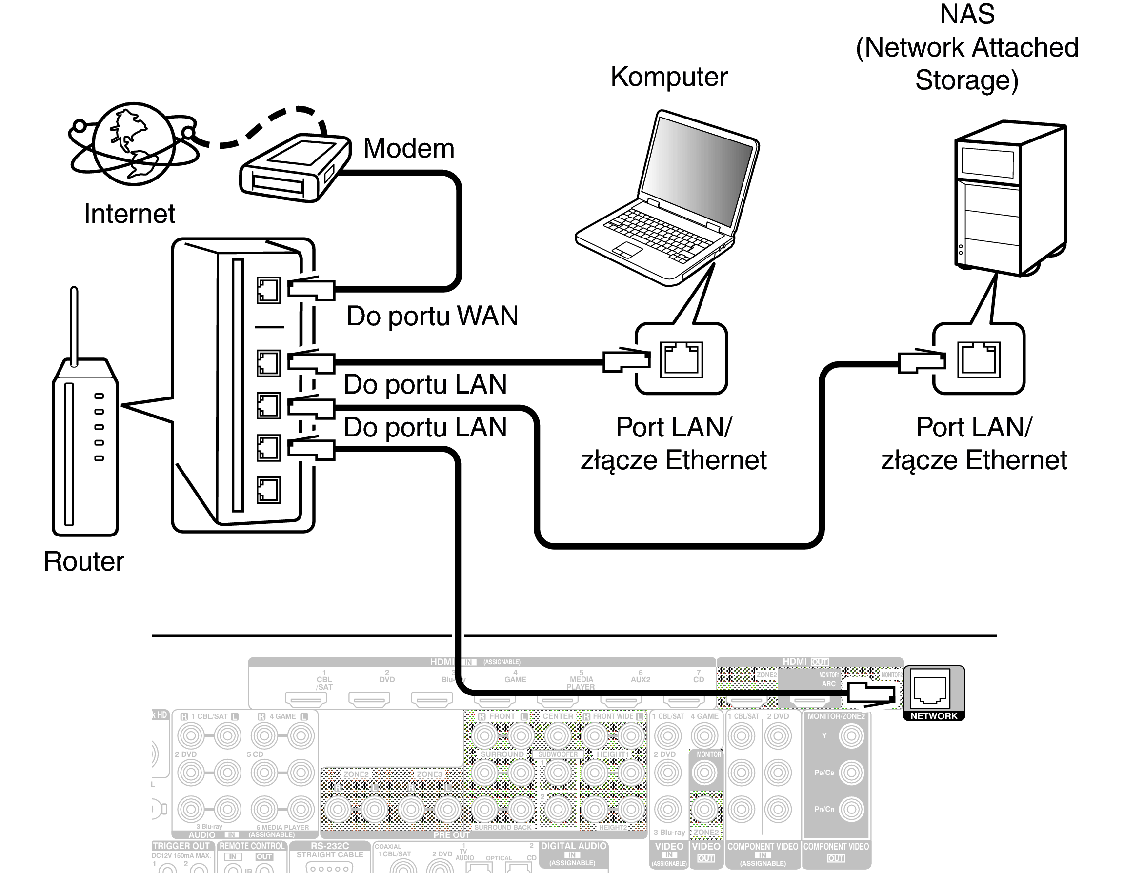 Aby połączyć przez przewodową sieć LAN, użyj kabla LAN, aby podłączyć router do urządzenia, tak jak pokazano na rysunku poniżej.