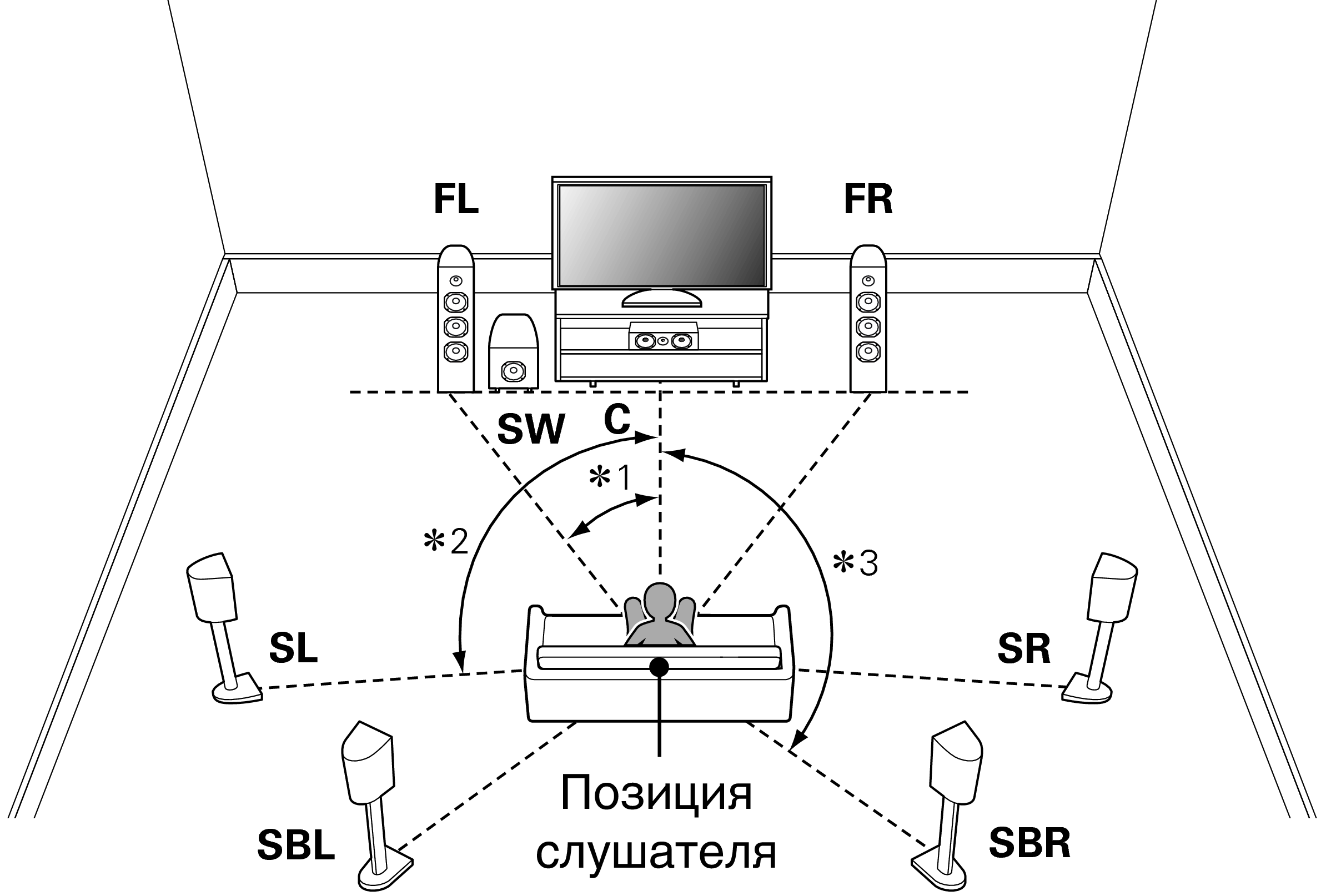 Установите левый и правый SURROUND BACK динамики объемного звучания позади основной позиции прослушивания на равном удалении от нее. При использовании только одного тылового динамика (SB) объемного звучания его следует установить непосредственно за позицией прослушивания. |