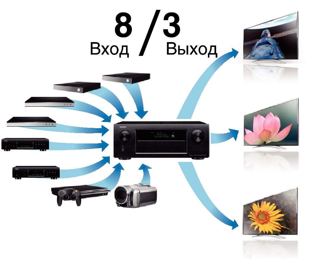 Разъемы HDMI позволяют подключать различные цифровые аудио- и видеоустройства (8 входов, 3 выход)