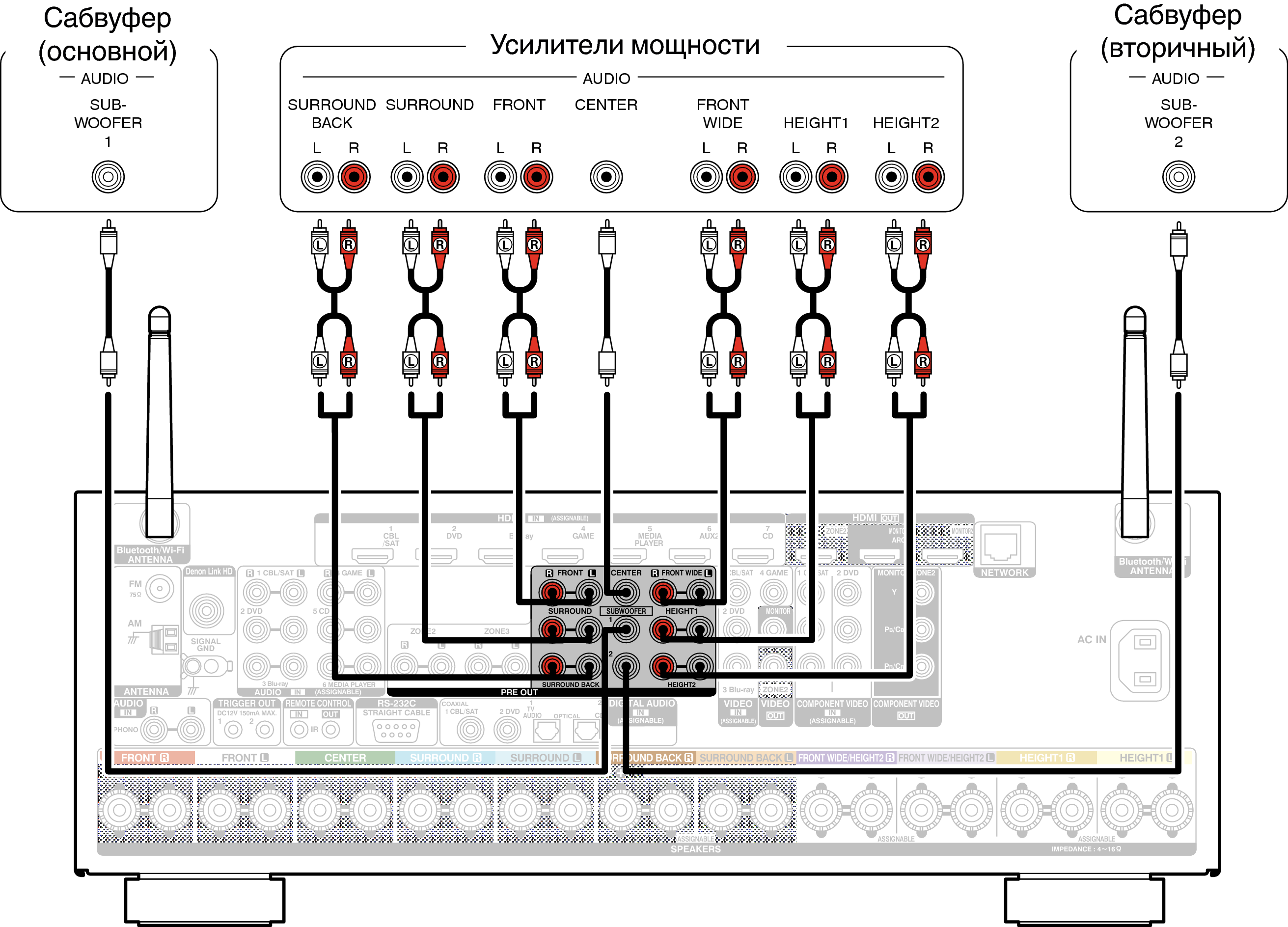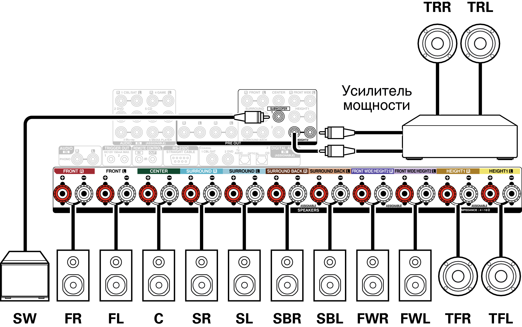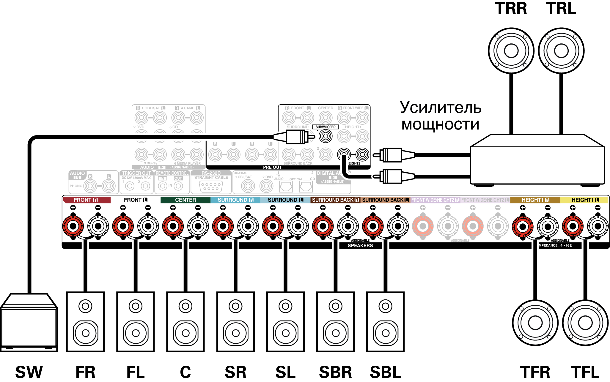 Данная системная конфигурация воспроизводит 11.1 каналов с помощью внешнего усилителя мощности.