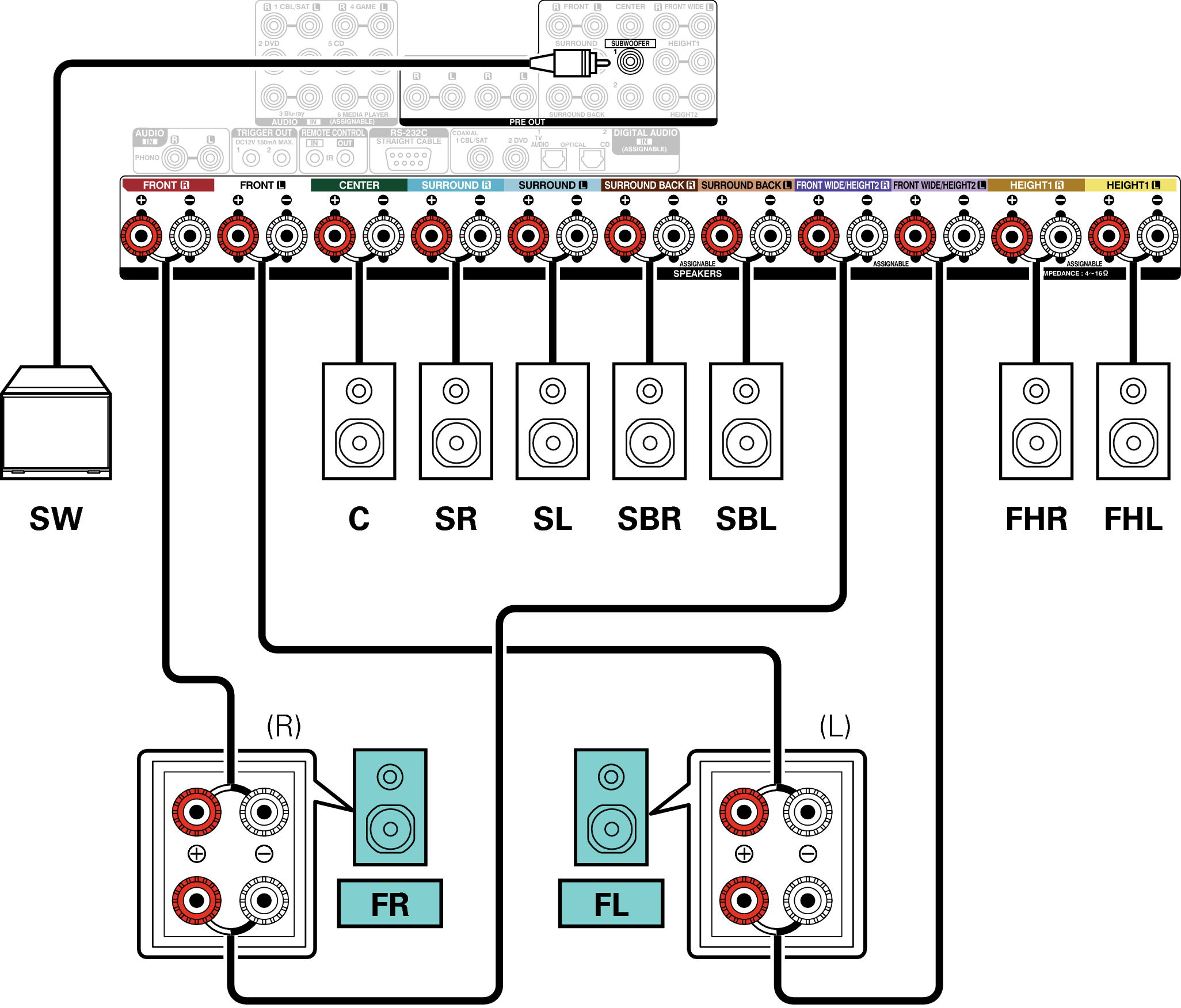Вы можете подключить динамики максимум для 13 каналов для MAIN ZONE с помощью внешнего усилителя мощности. При подключении динамиков для 12 или более каналов воспроизводящие звук динамики автоматически переключатся в зависимости от входного сигнала и режима звука.