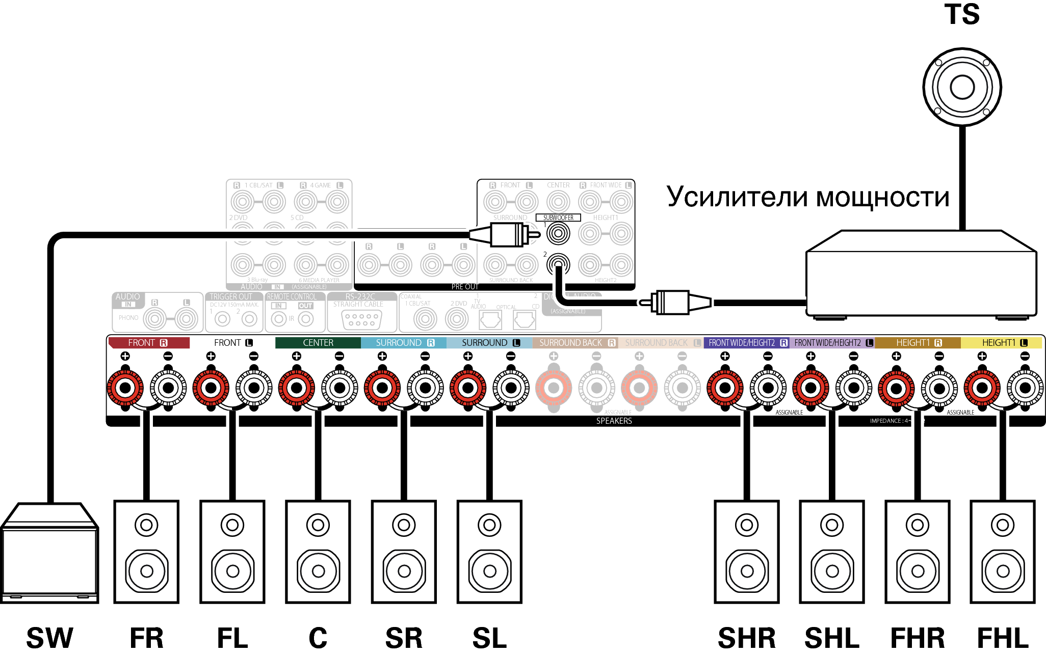 Вы можете использовать данное устройство в качестве предусилителя, подключив внешний усилитель мощности к разъемам PRE OUT. Посредством добавления усилителя на каждый канал, реальность звука можно улучшить.