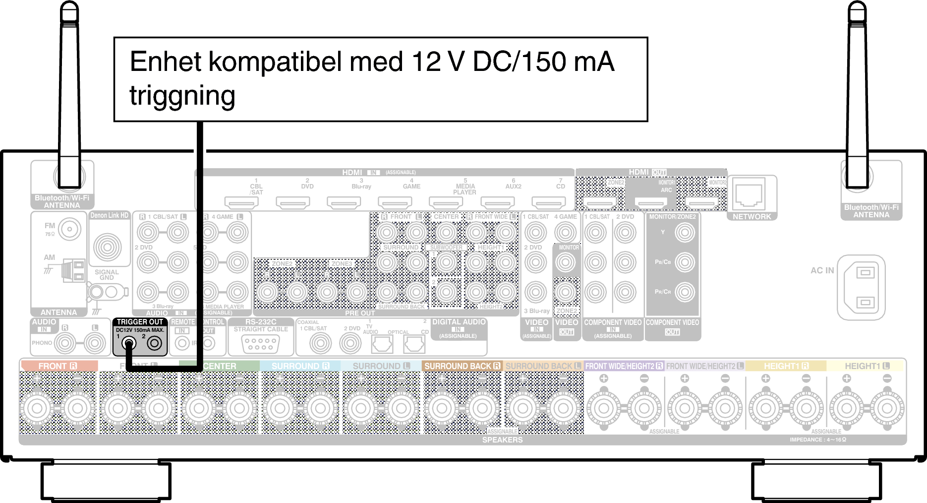 När du ansluter en enhet med TRIGGER IN-anslutning kan du slå på eller sätta enheten i standbyläge via länkad styrning från den här enheten.