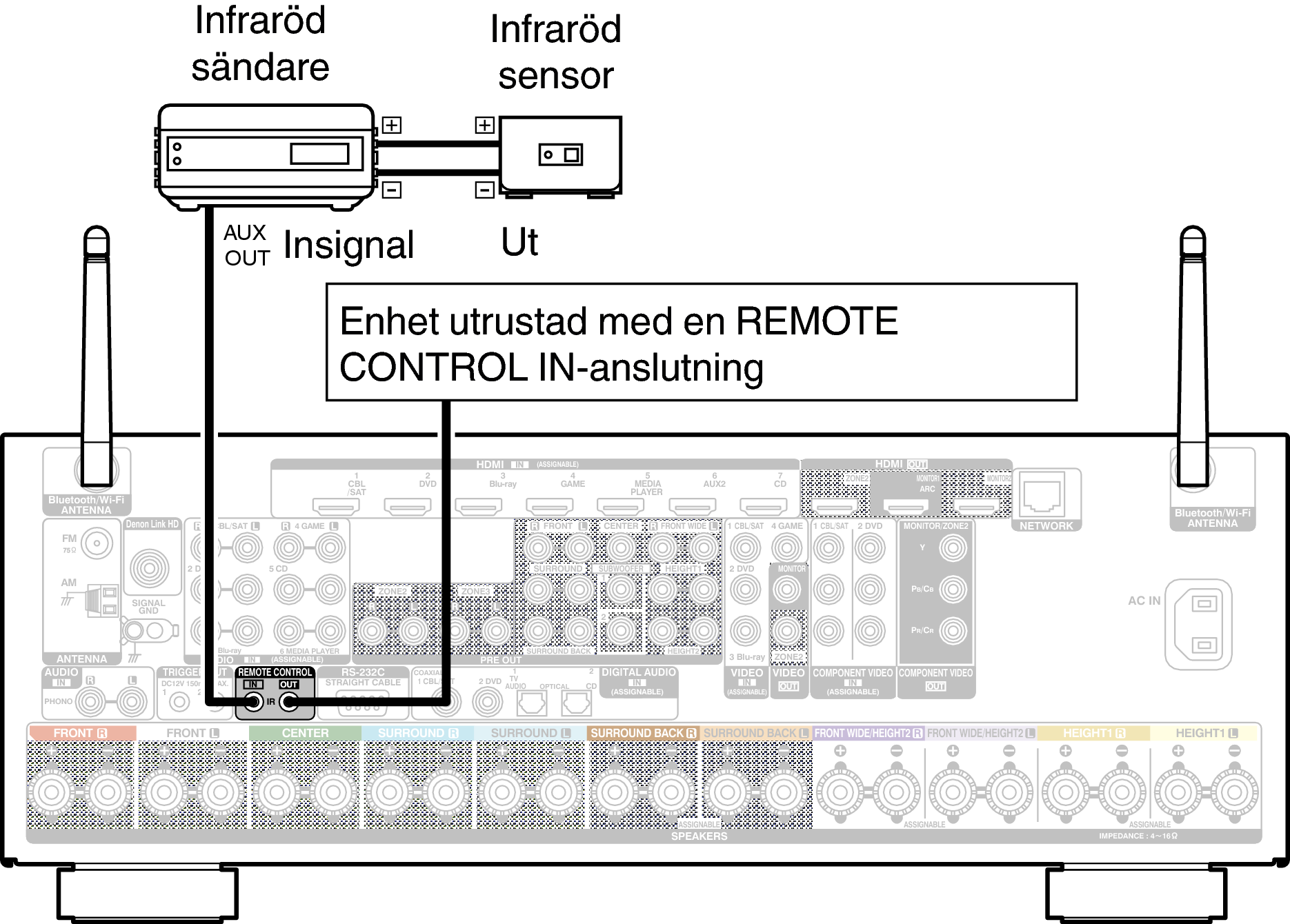 Om den här enheten installeras på en plats där fjärrkontrollens signal inte når (t.ex. installation i ett skåp) kan den fortfarande kontrolleras av en fjärrkontroll genom att ansluta en fjärrkontrollsmottagare (säljs separat).