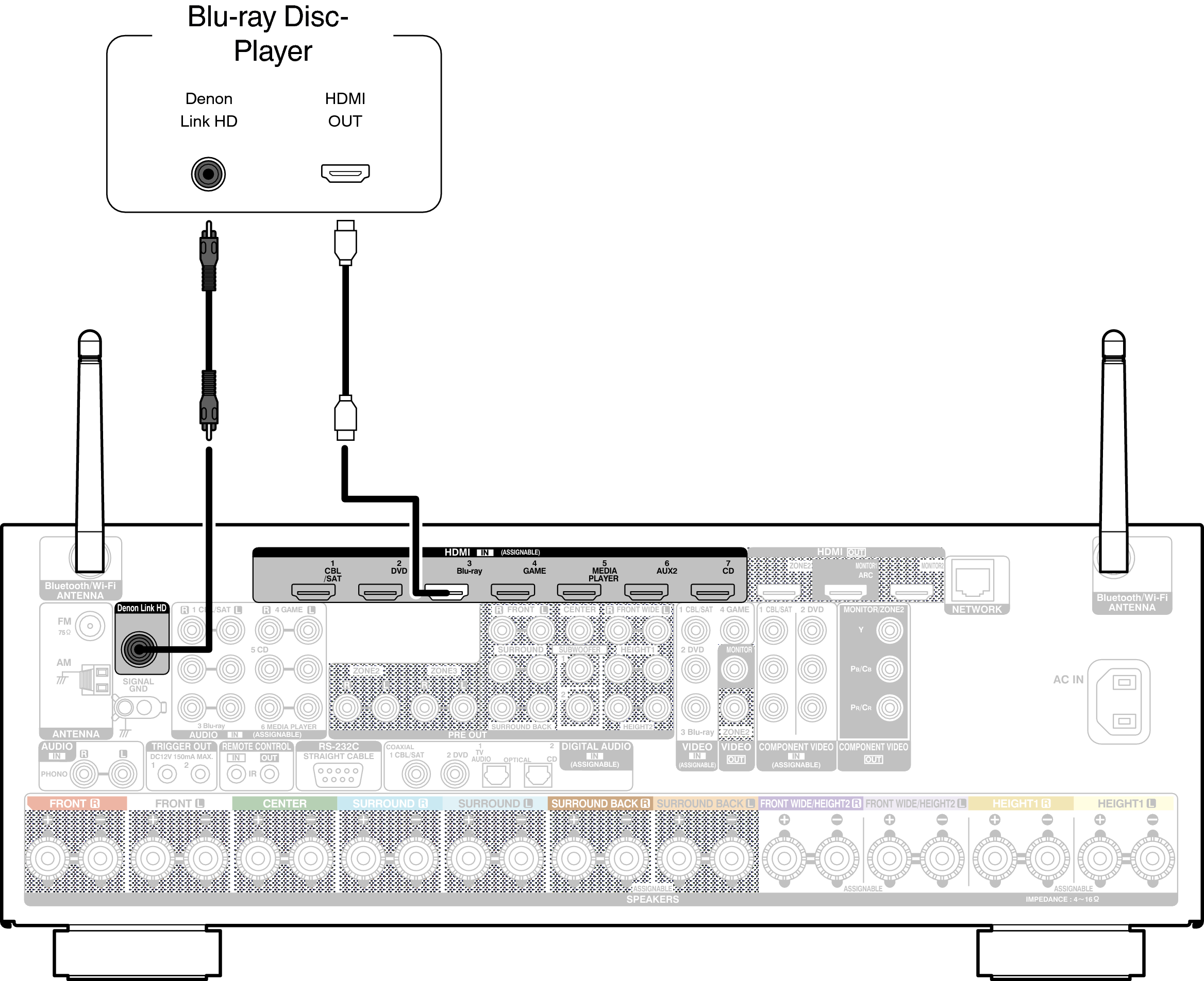 Wenn Sie einen Player, der mit der Denon Link HD-Funktion kompatibel ist, über den Denon Link HD-Anschluss anschließen, ist die Wiedergabequalität im Vergleich zu einem reinen HDMI-Anschluss besser.