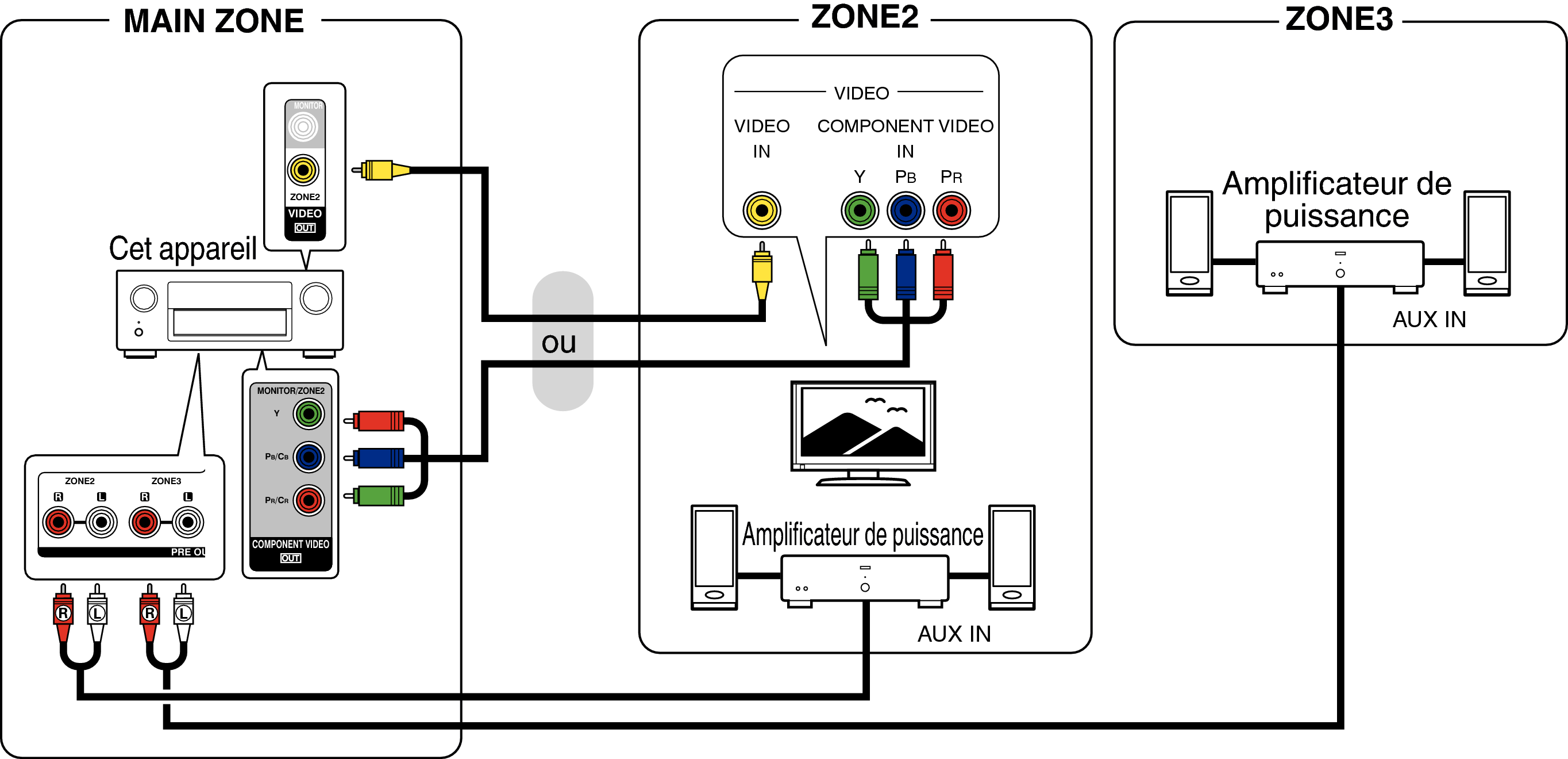 Lorsque “Sortie vid.composantes” dans le menu est défini sur “ZONE2”, la borne de sortie vidéo composante transmet la vidéo de la ZONE2. lien
