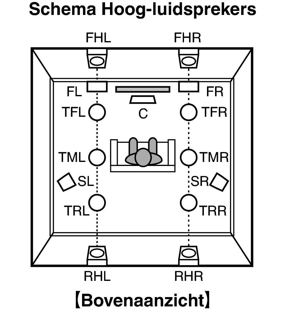 Plaats de linker- en rechterluidsprekers FRONT HEIGHT direct boven de voorluidsprekers. Monteer ze zo dicht mogelijk bij het plafond en richt ze naar de hoofdluisterpositie. |