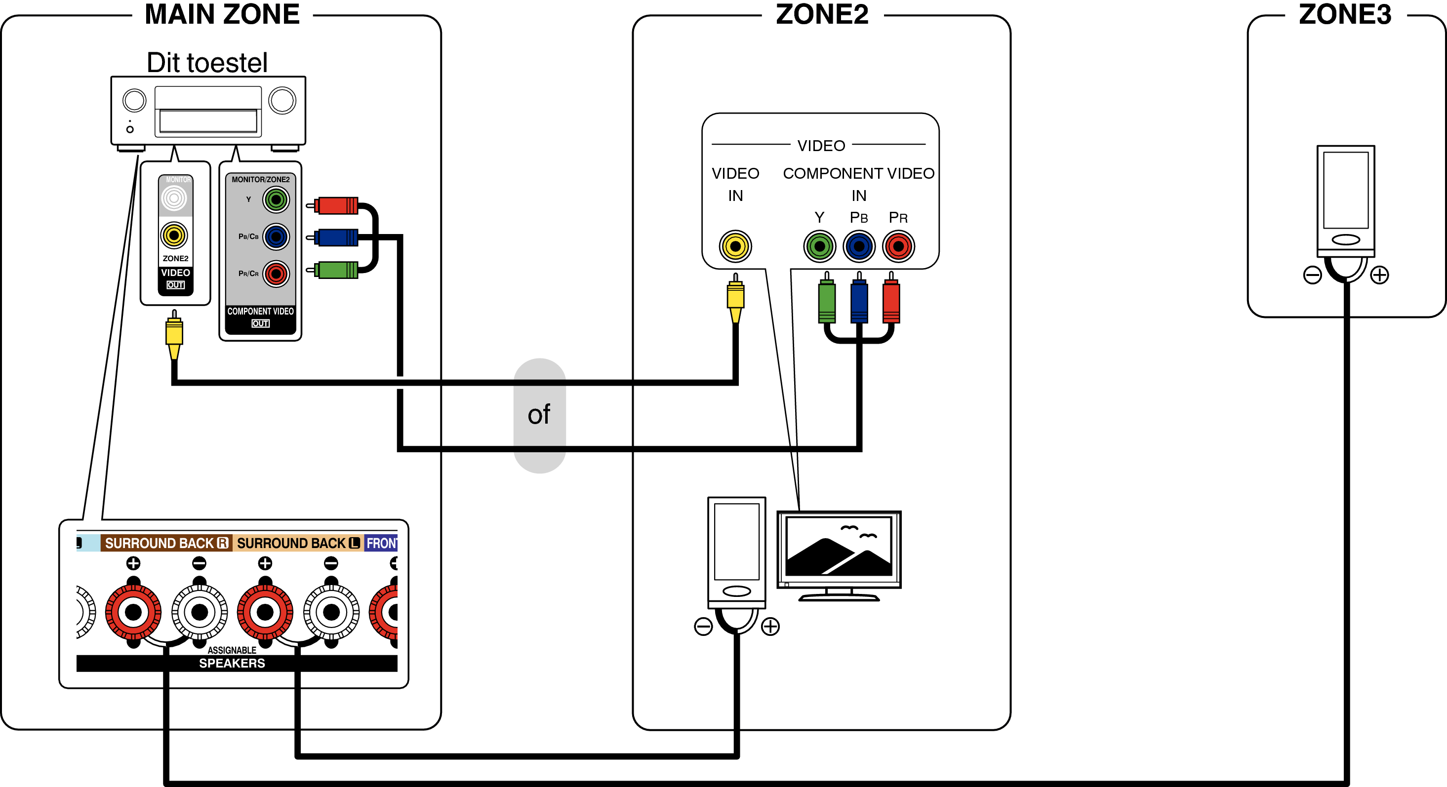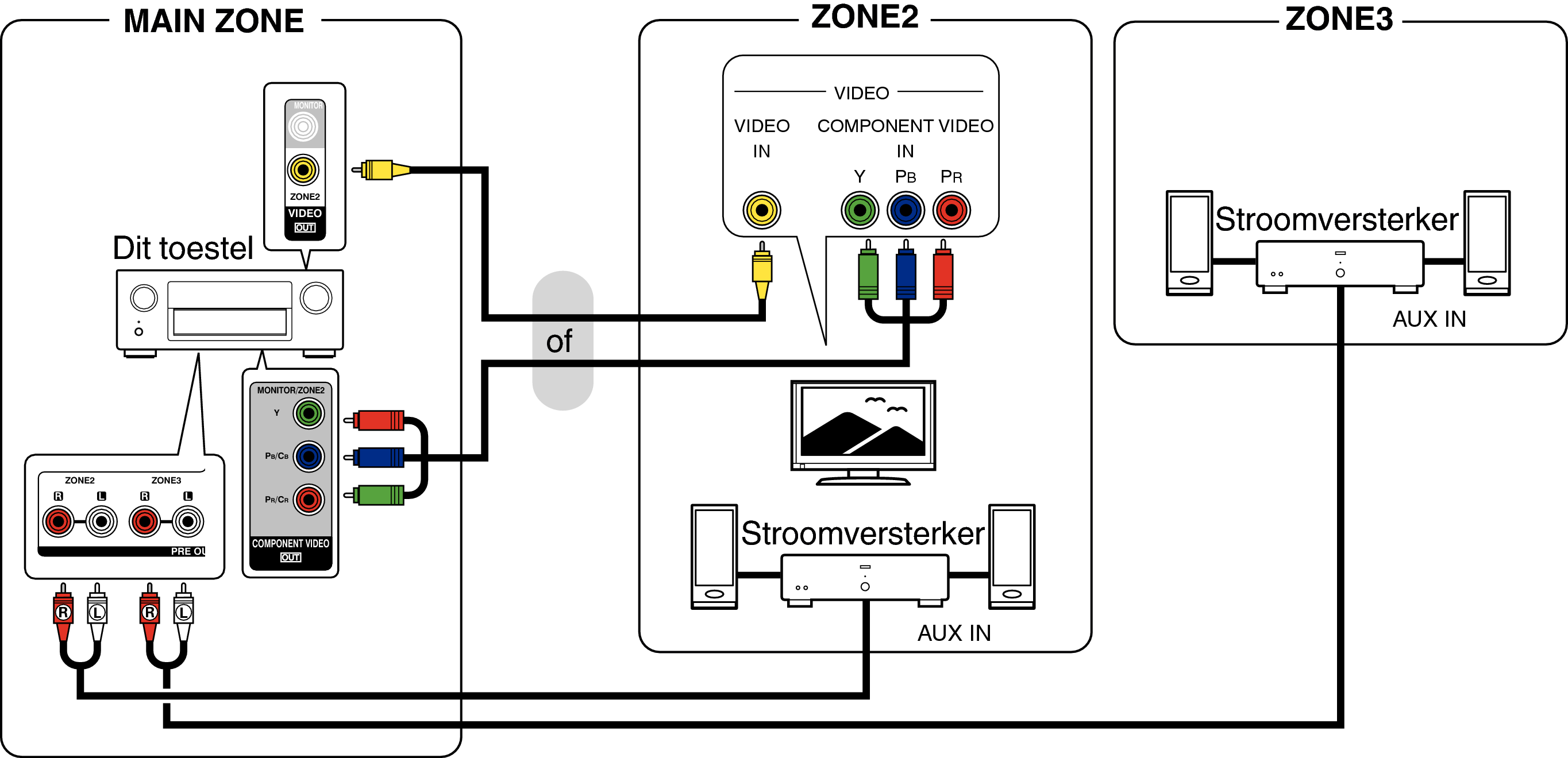 De audiosignalen van de ZONE2- en ZONE3-audio-uitgangen van dit toestel worden uitgevoerd naar de ZONE2- en ZONE3-versterkers en afgespeeld via deze versterkers.