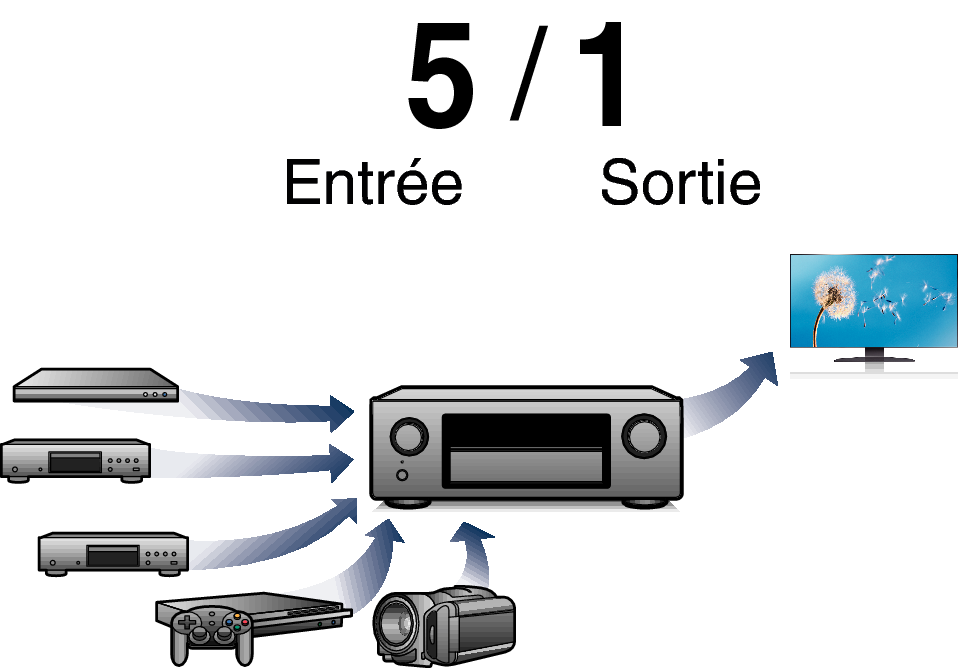 Cet appareil est équipé de 5 entrées HDMI et de 1 sortie HDMI permettant la connexion à divers appareils compatibles HDMI tels que des lecteurs Blu-ray Disc, des consoles de jeux et des caméscopes HD.
