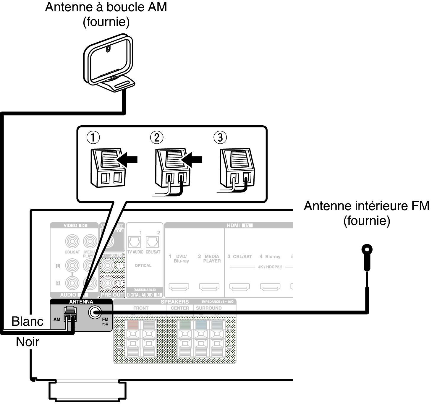 Assurez-vous que les bornes des fils de l’antenne à boucle AM n’entrent pas en contact avec les parties métalliques du panneau.