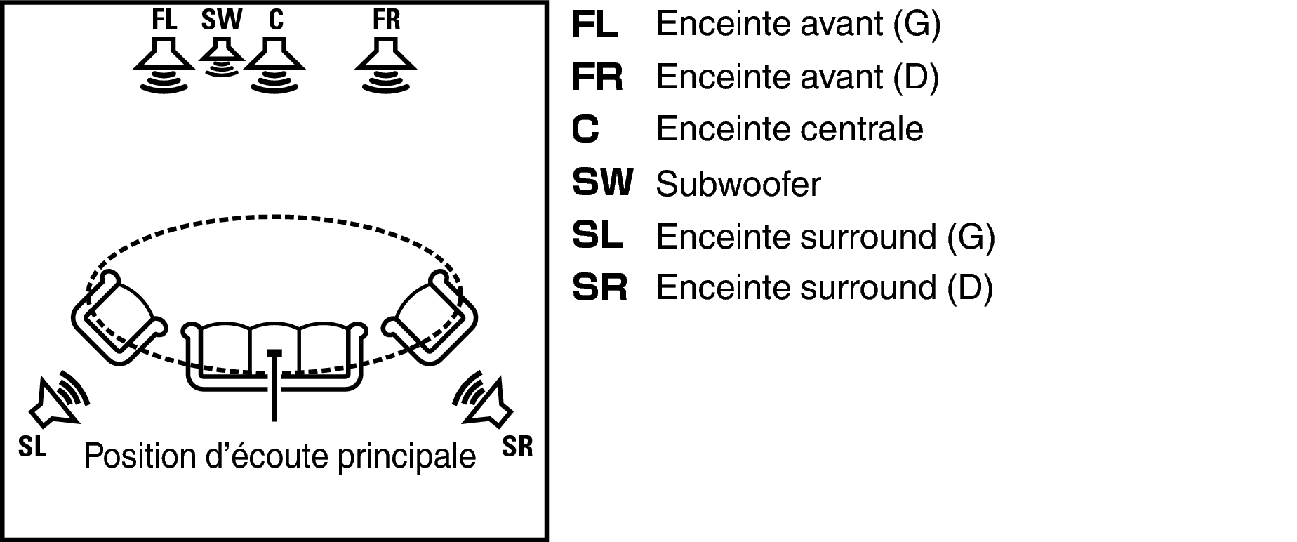 La position d’écoute principale est la position où plusieurs auditeurs ou une personne seule s’assoient naturellement dans l’enceinte de l’environnement d’écoute. Avant de lancer “Config. auto”, disposez le microphone d’étalonnage de son en position d’écoute principale.