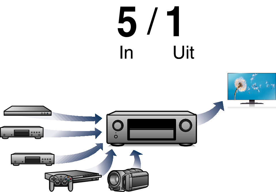 HDMI-aansluitingen voor het verbinden van diverse digitale AV-apparaten (5 ingangen, 1 uitgangen)