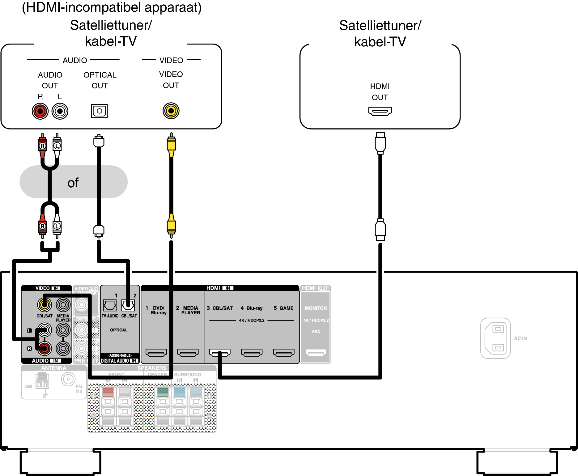Deze toelichting gebruikt de aansluiting met een satelliettuner/kabel-tv STB als voorbeeld.