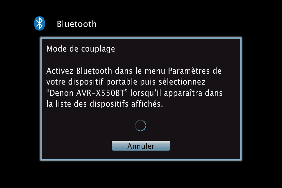 Lors de la prochaine commutation de la source d’entrée sur le Bluetooth, cet appareil se connectera automatiquement au dernier périphérique Bluetooth connecté.