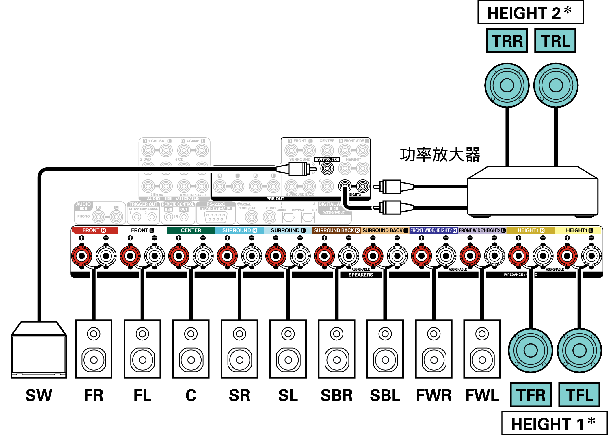 可以连接后置纵向扬声器,而不是前置纵向扬声器。在这种情况下,请在菜单中“高度” - “布局”下设置要连接的纵向扬声器。链接
