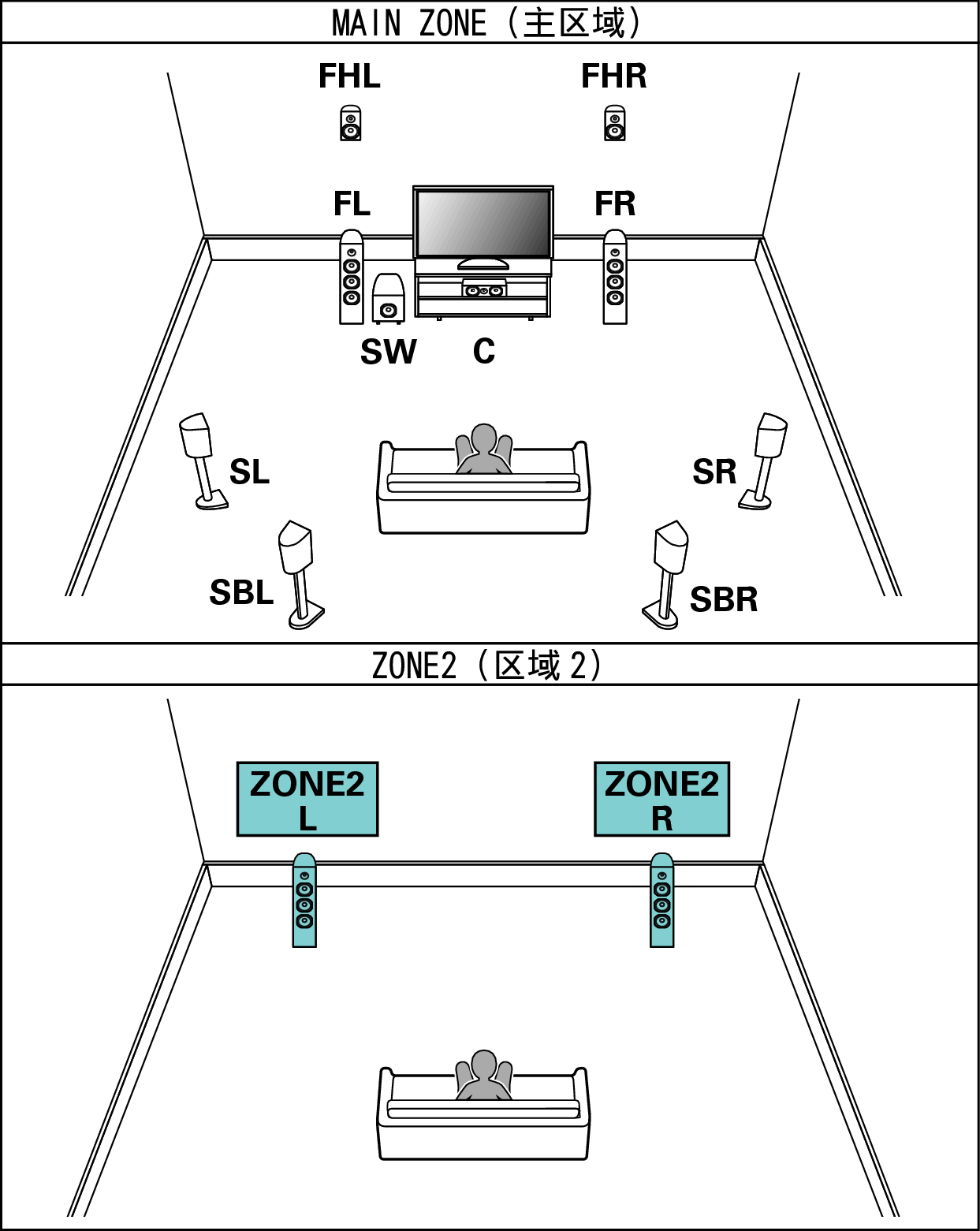 这种类型的配置在MAIN ZONE(主区域)中播放7.1声道,在ZONE2(区域2)中播放2声道。