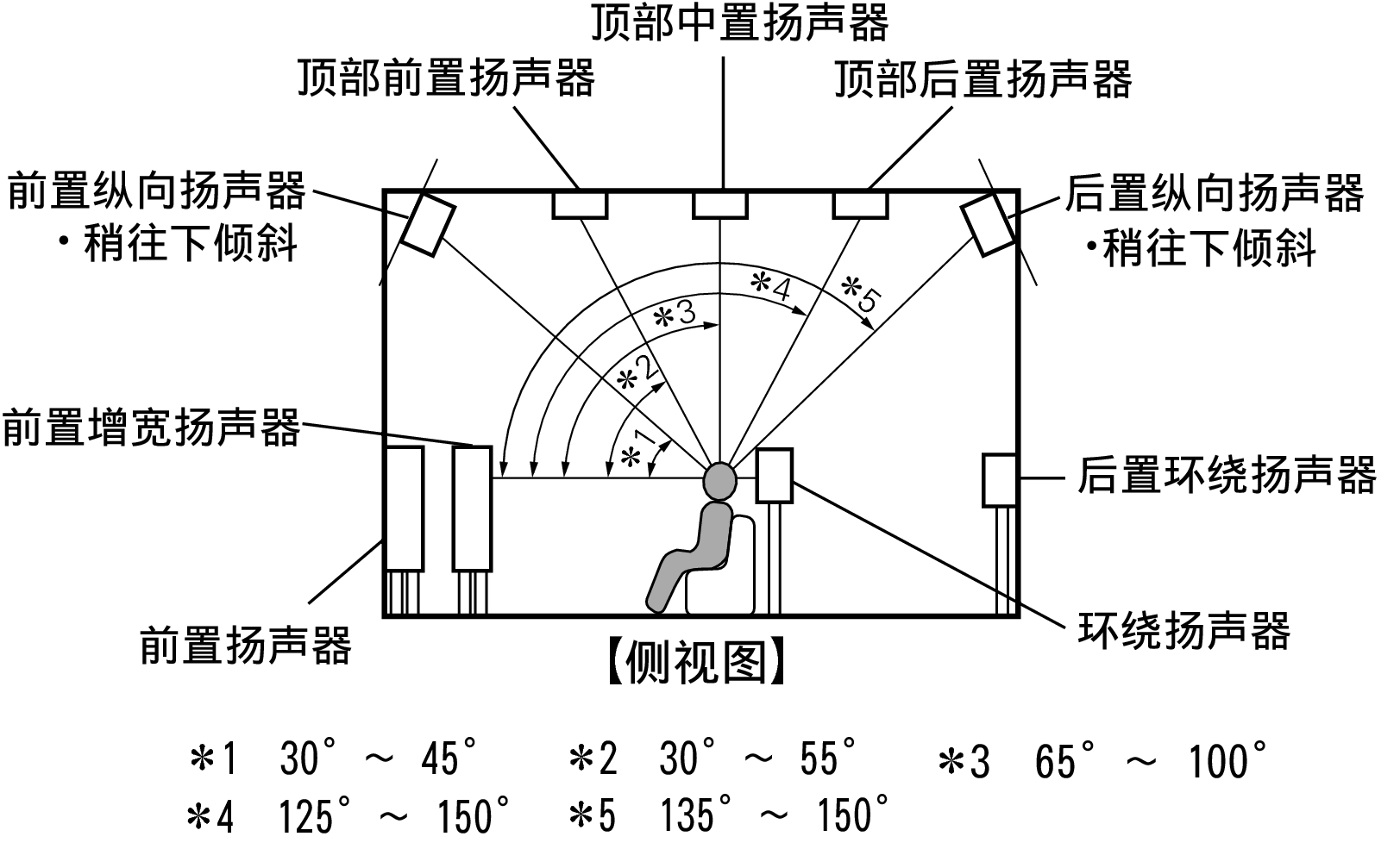 将顶部中置扬声器 (左/右) 安装在主聆听位置的正上方,并与左右前置扬声器对齐。