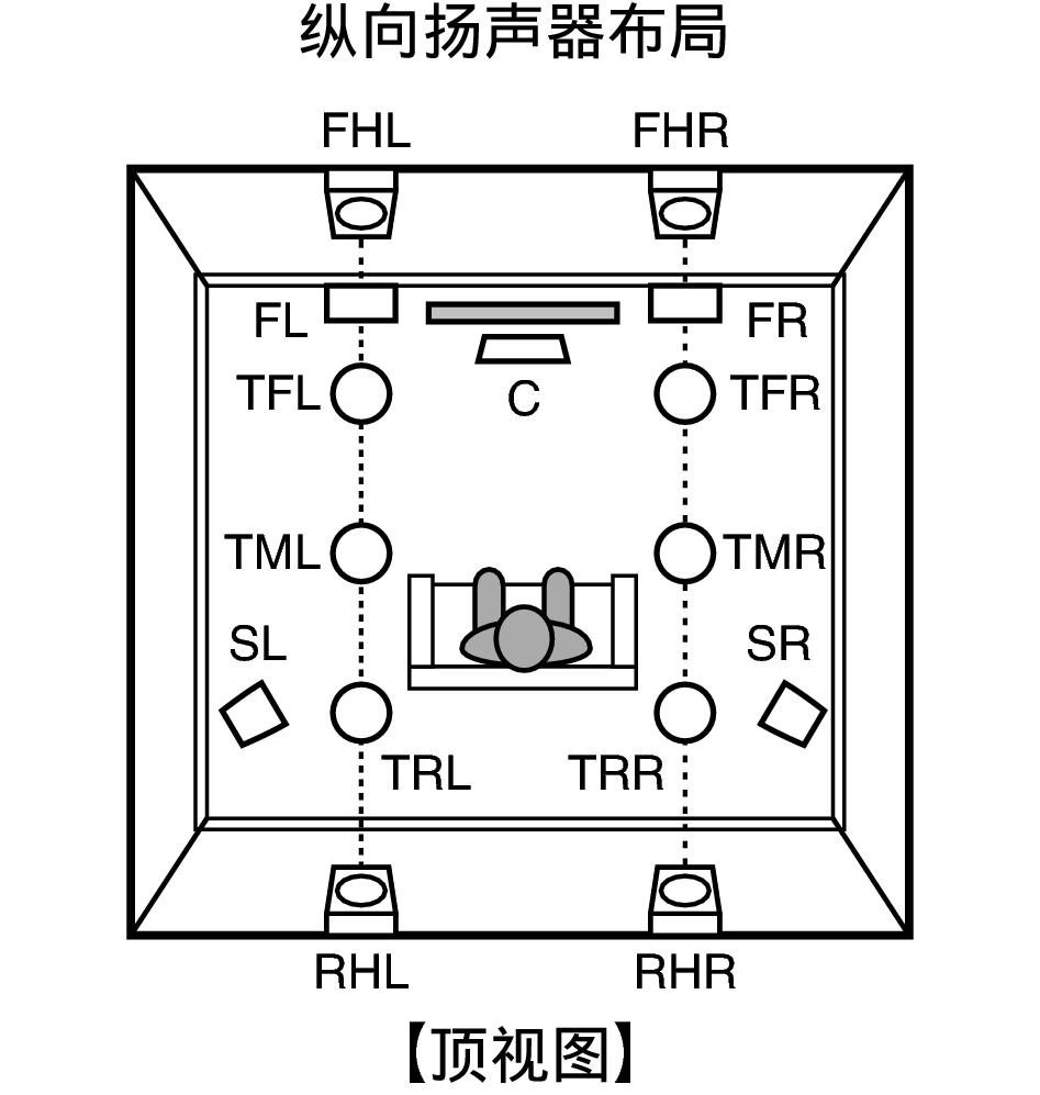 包含纵向扬声器和天花板扬声器的布局