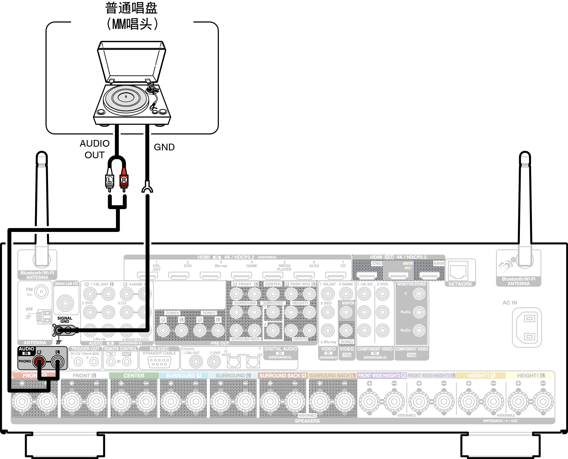 本机兼容配备Phono动磁(MM)唱头的电唱机。当连接至带有低输出动圈(MC)唱头的电唱机时,使用市售的动圈(MC)唱头放大器或升压变压器。