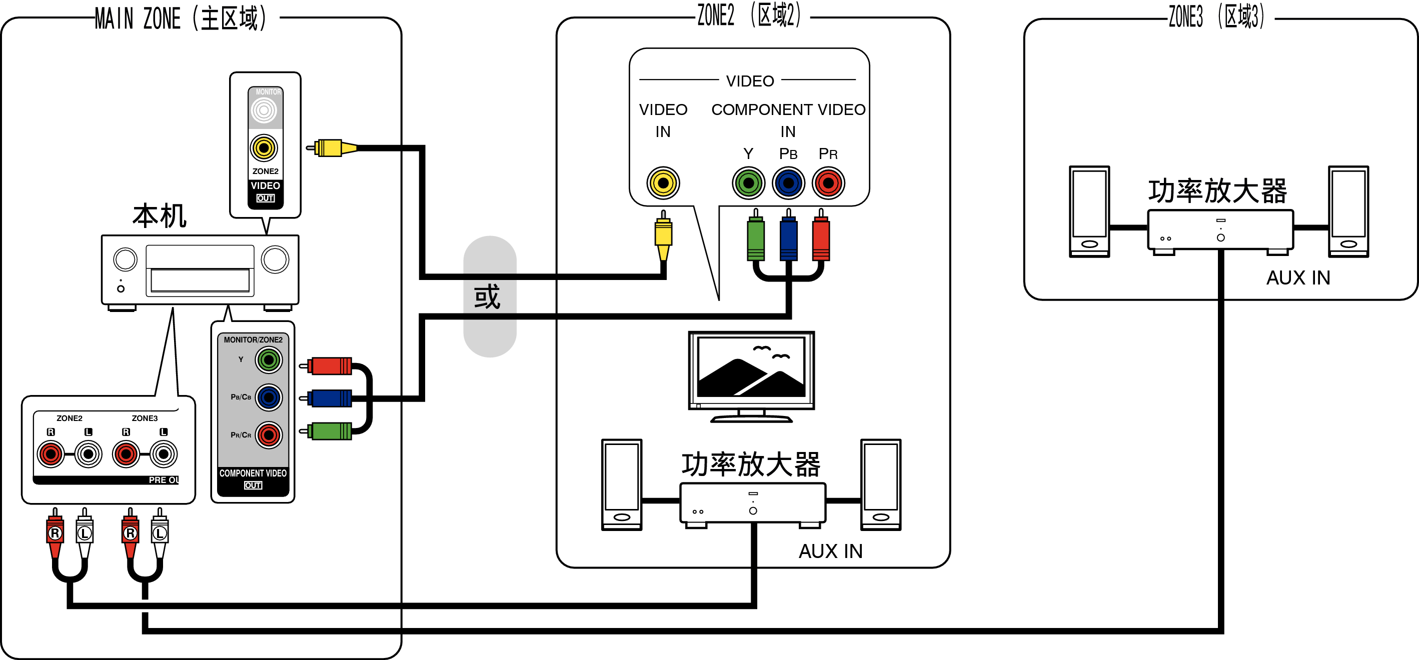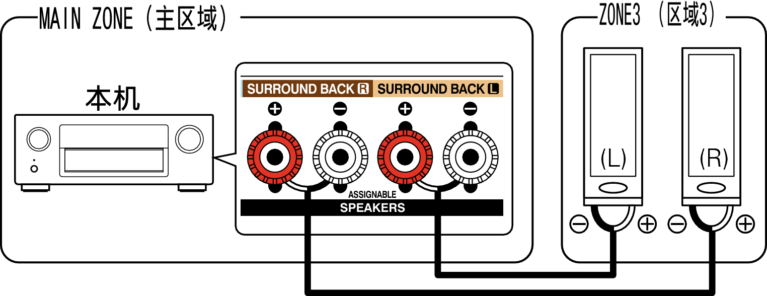 本机的ZONE2 (区域2) 和ZONE3 (区域3) 音频输出端子的音频信号输出到ZONE2 (区域2) 和ZONE3 (区域3) 功率放大器并在这些放大器上播放。