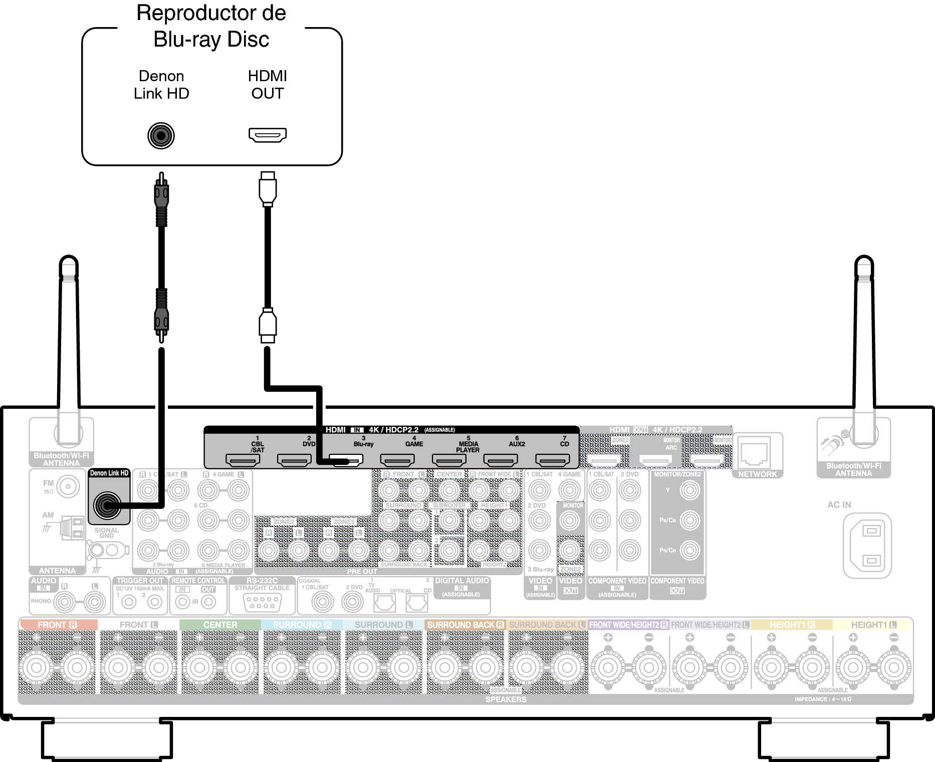 Se necesitan las conexiones HDMI y Denon Link HD para este método de conexión.